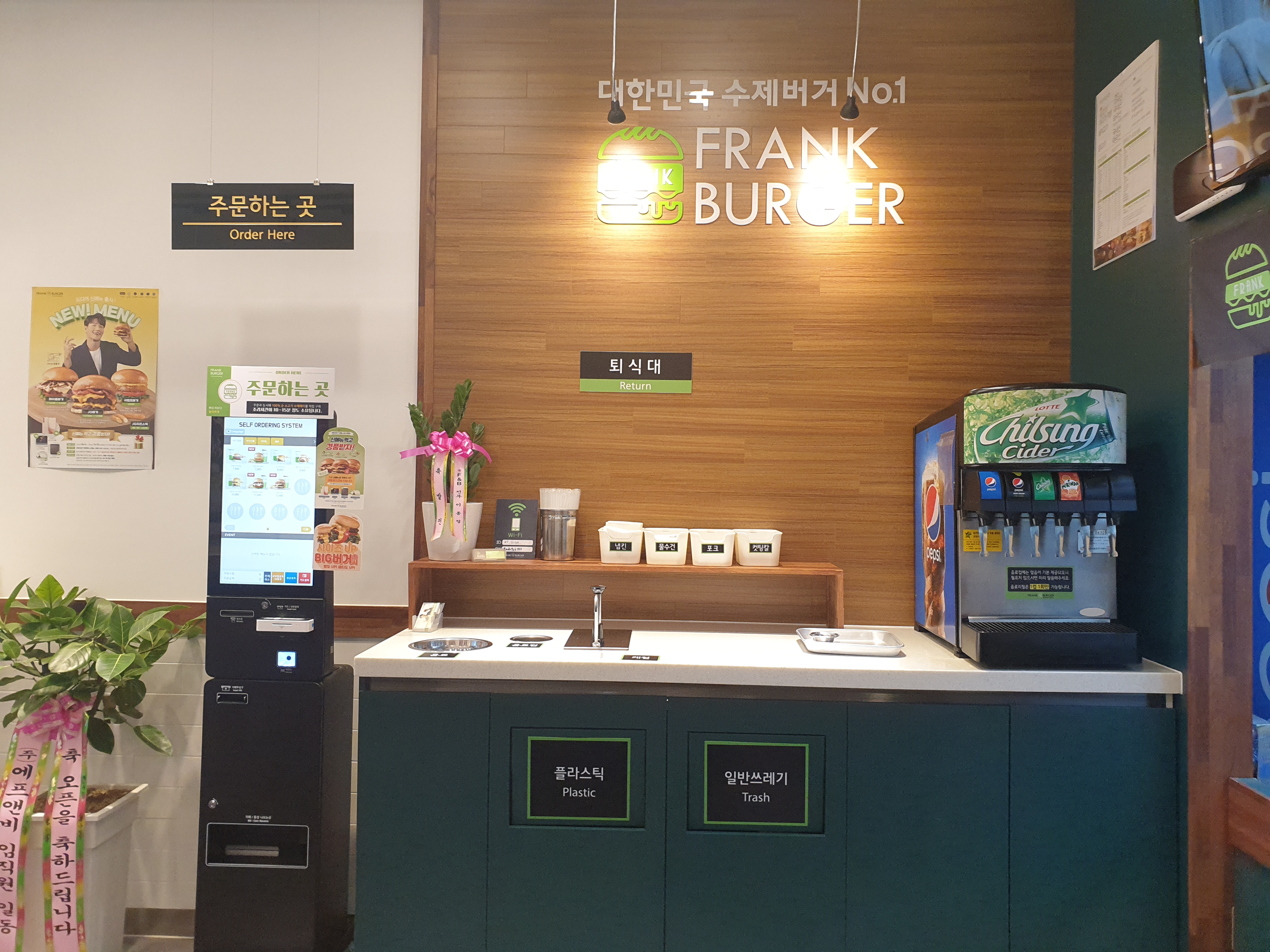키오스크 옆에 퇴식대와 셀프바가 같이 있어요