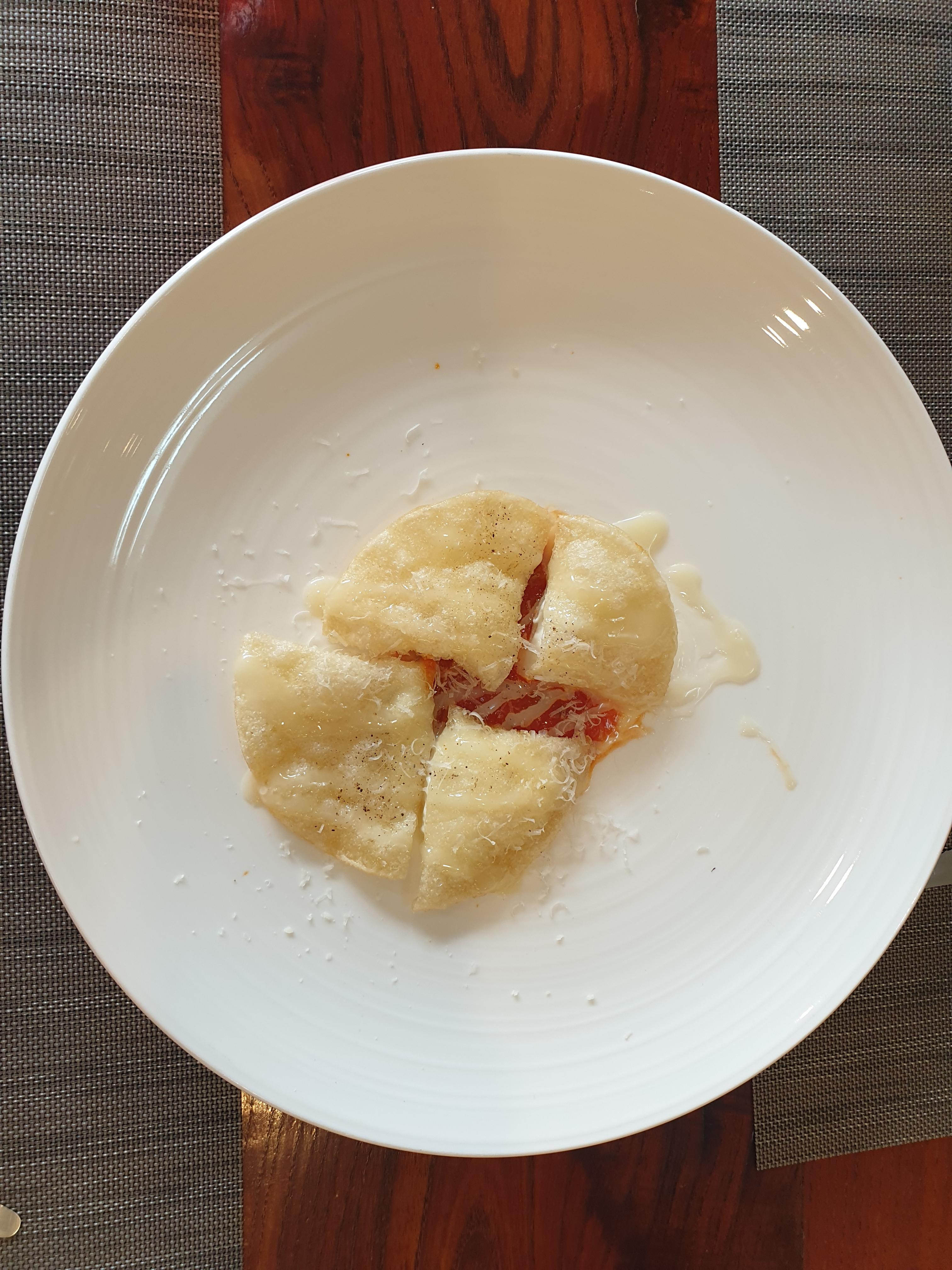튀김 안에 치즈가 들어있고 바닥에는 토마토소스!