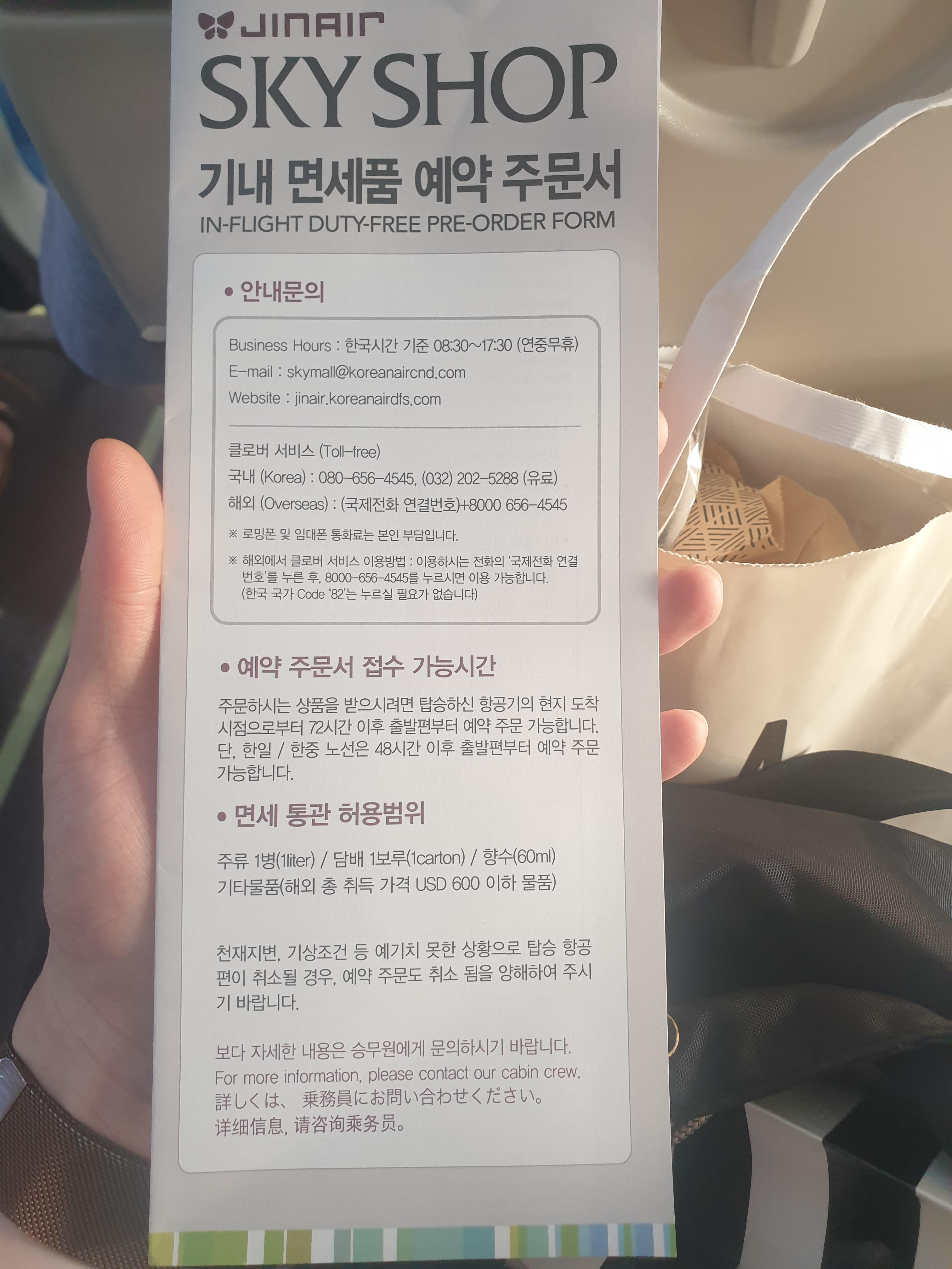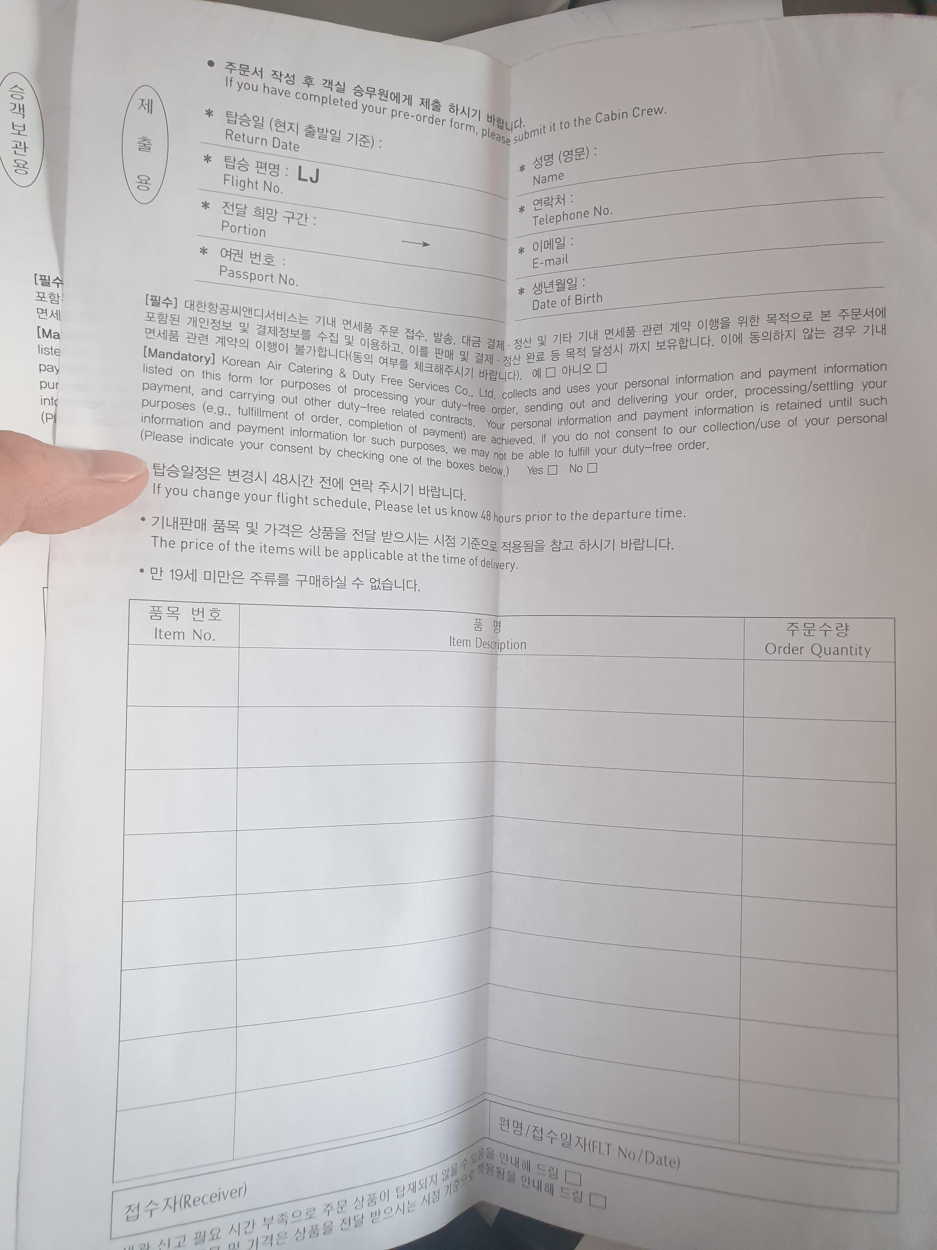 이 종이에다가 작성하시고 승무원에게 주시면 됩니다