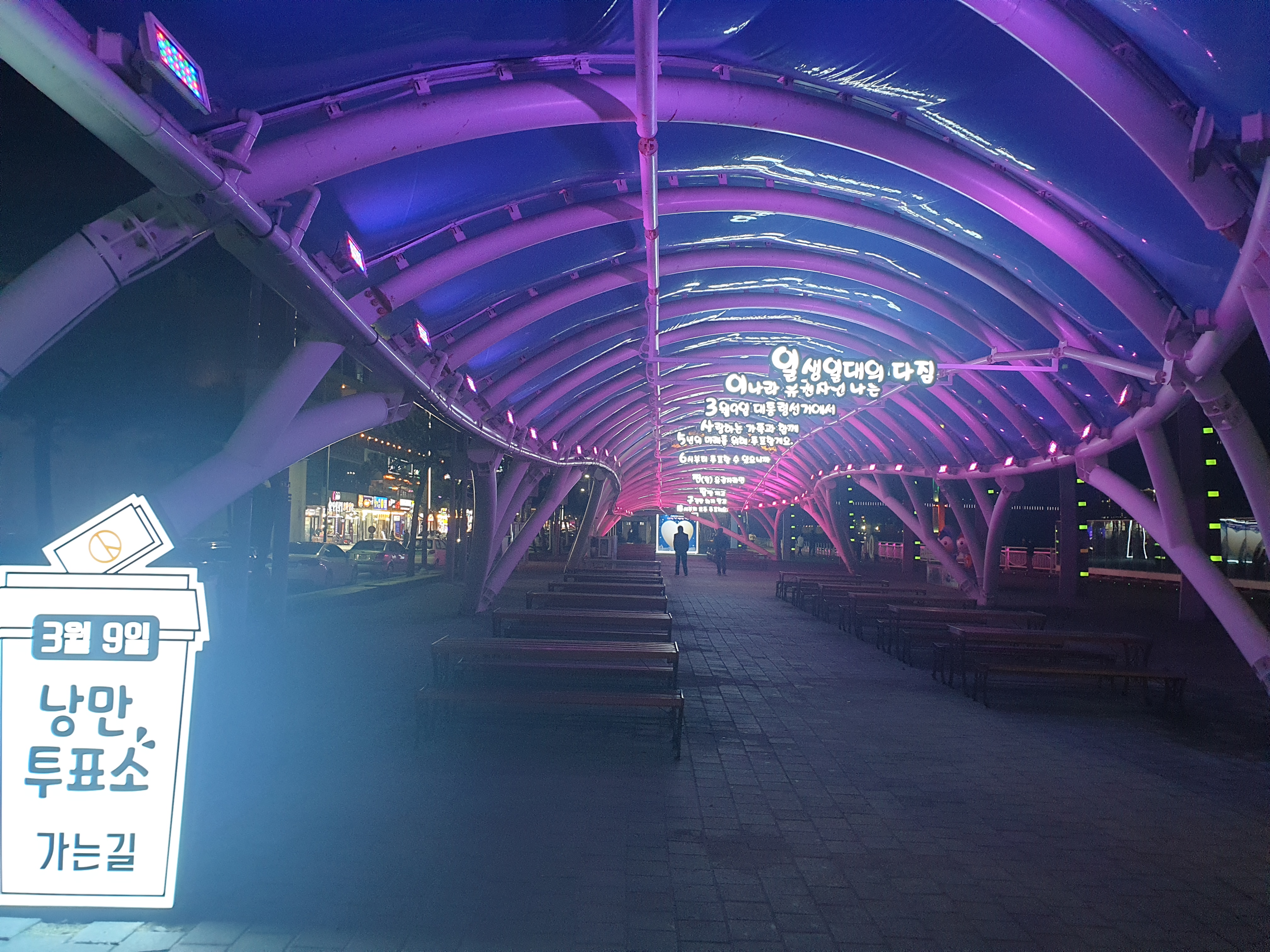 3월 9일 낭만 투표소 가는 길이라고 간판이 있어요