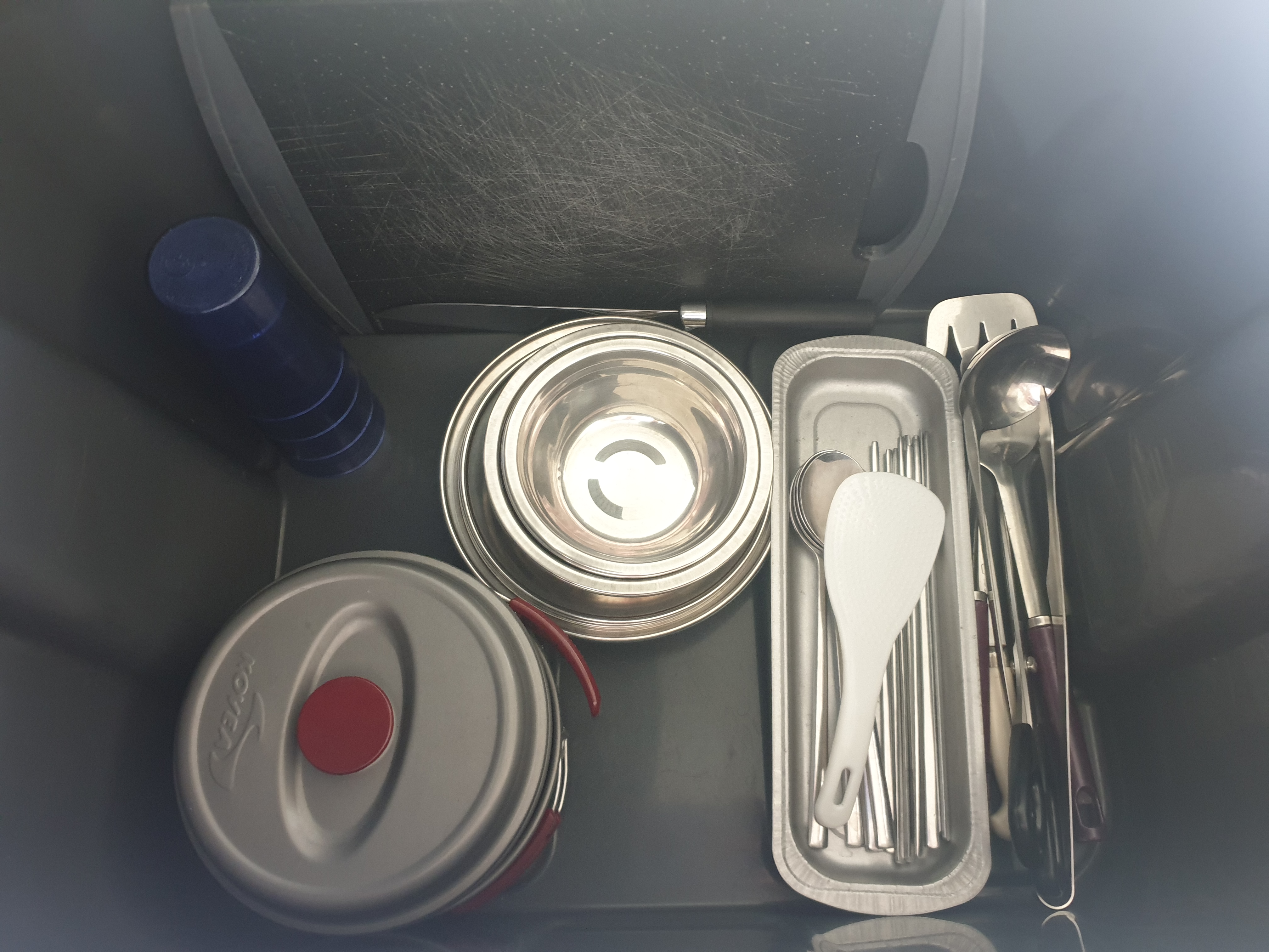 검은색 상자에 주방용품들이 들어있어요