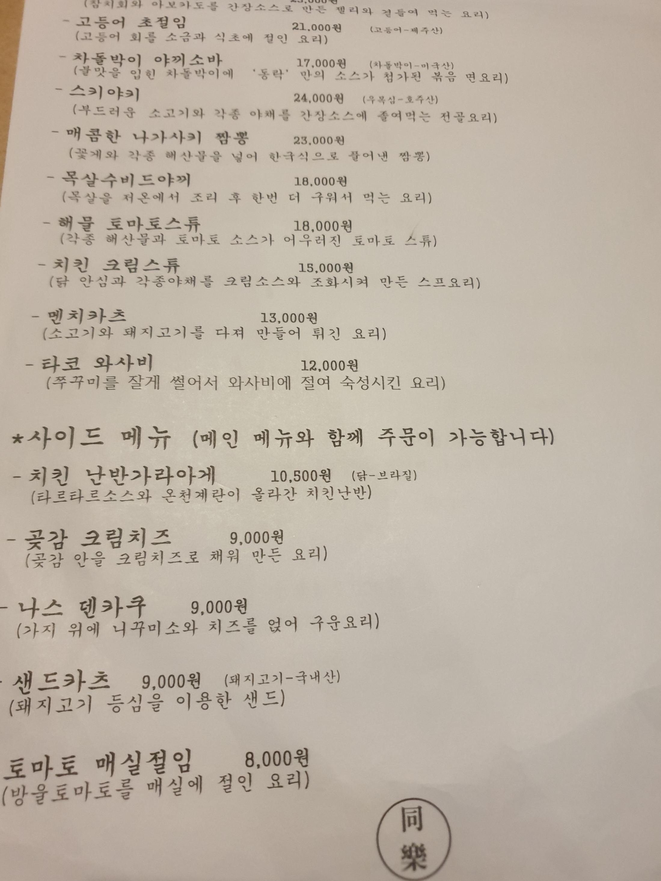 동락에서 다양한 메뉴에 술 한잔 어떠세요?