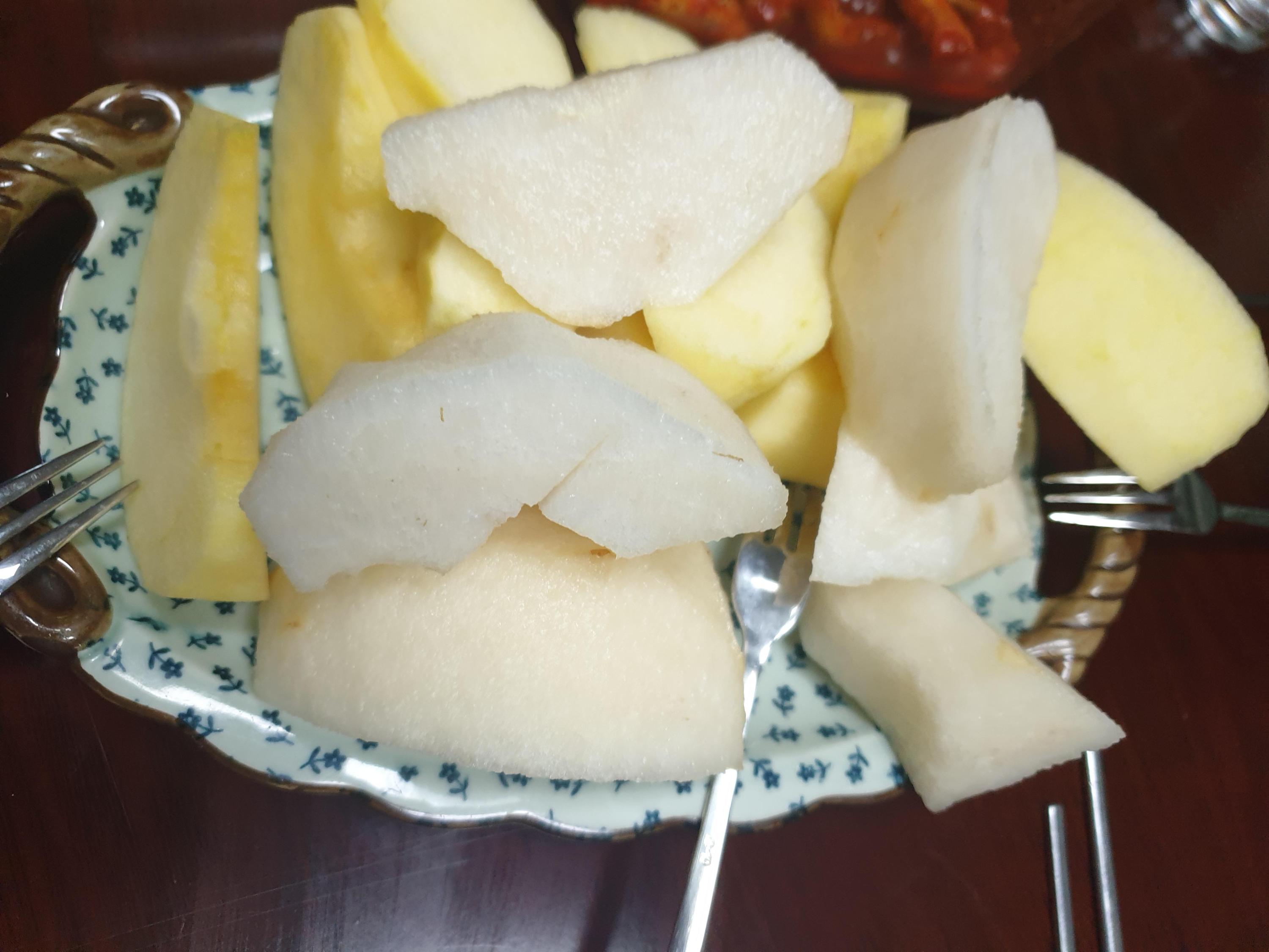 뭐하니 하고 봤더니 사과랑 배를 자르고 있네요