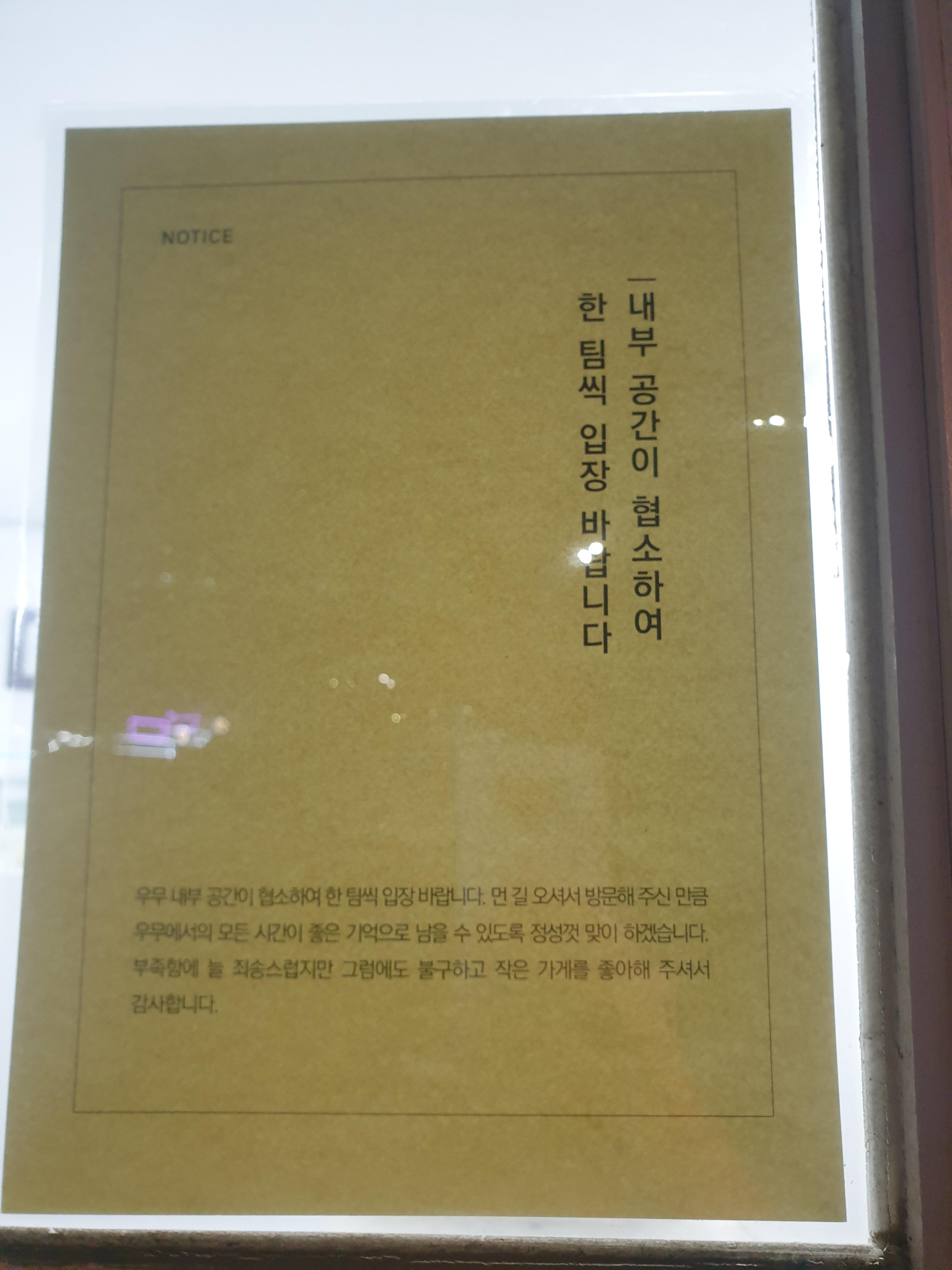 내부 공간이 협소하여 한 팀씩 입장 바랍니다라고