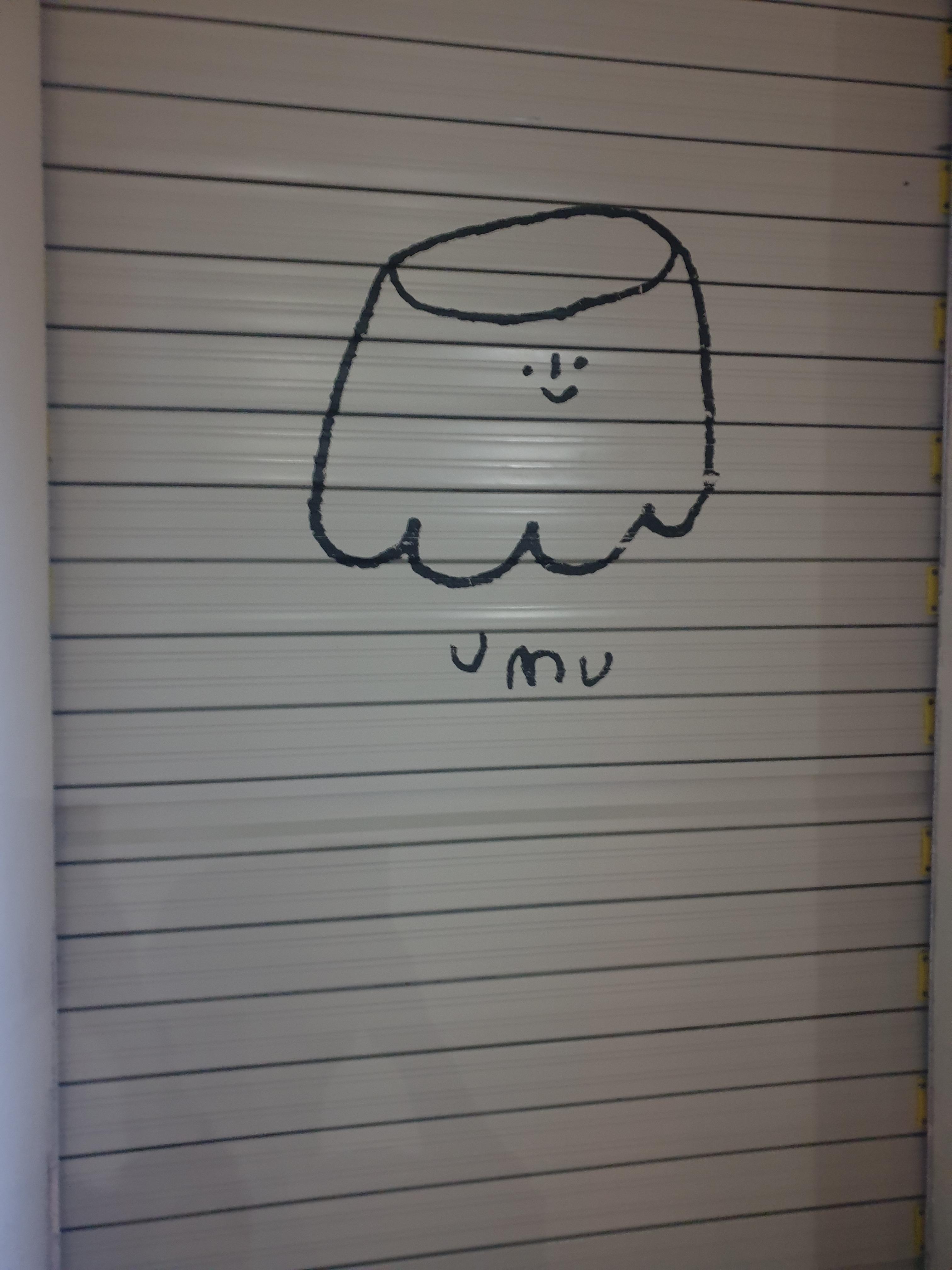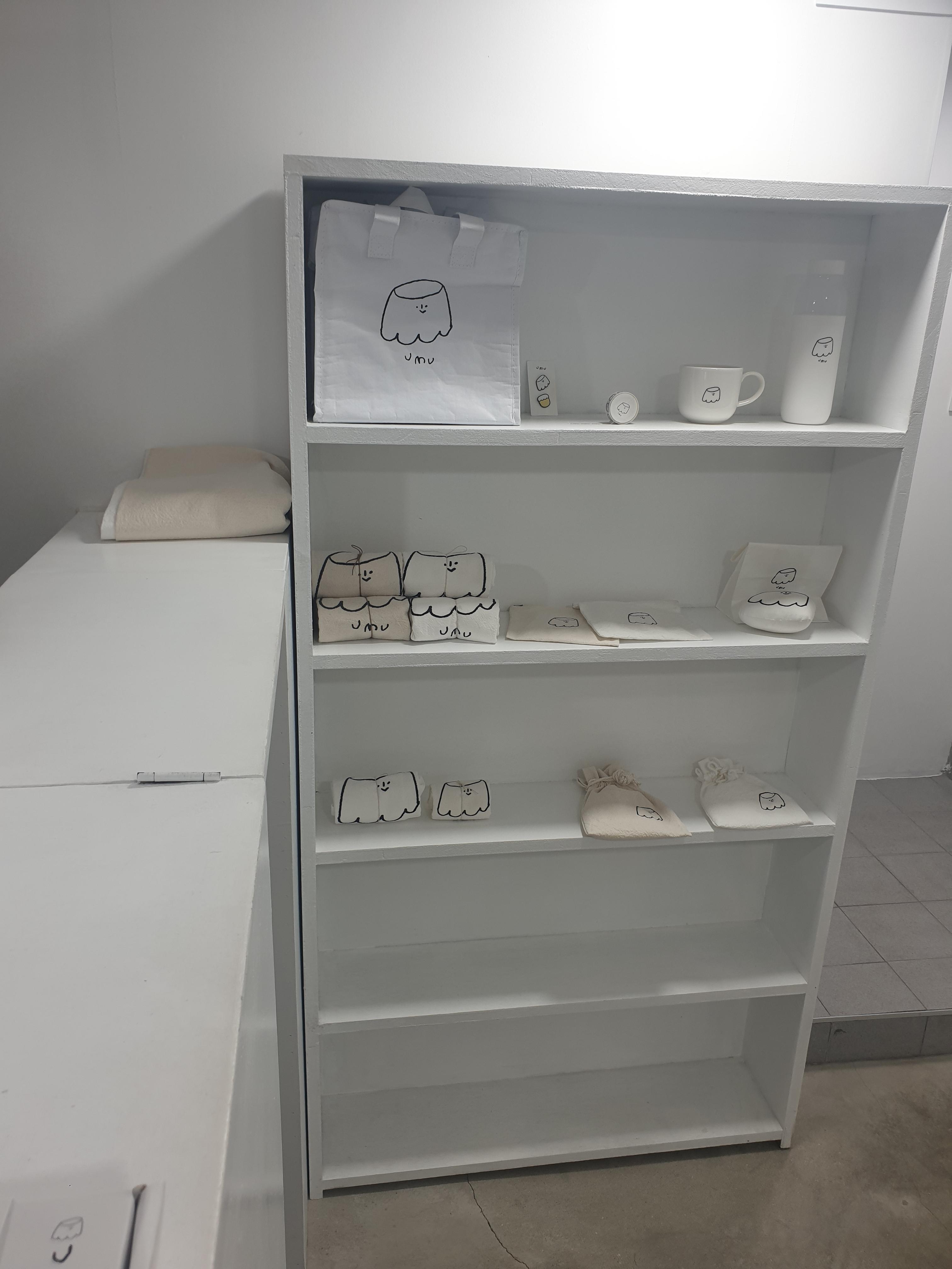 셔터 앞에 그려진 우무 캐릭터 앞에서