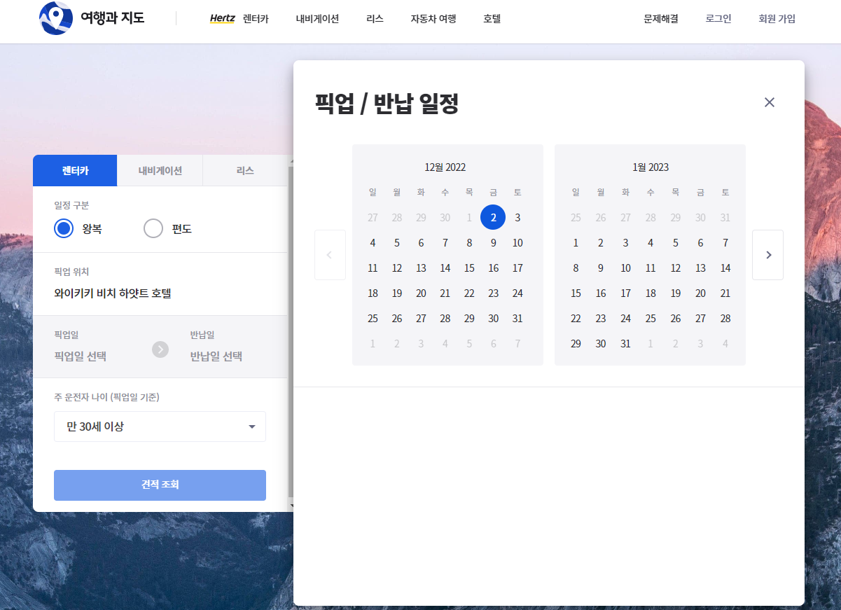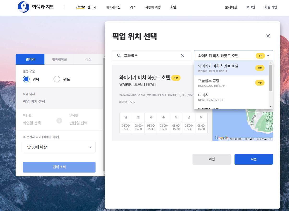 여행과 지도 사이트에서 미국 하와이 렌터카 예약