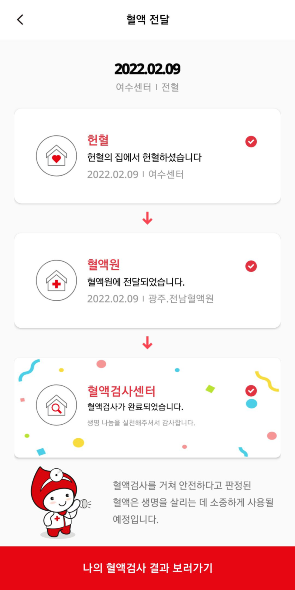 이번에 했던 여수센터에서 광주, 전남혈액원으로 가서 혈액검사까지 완료가 되었다고 왔습니다!