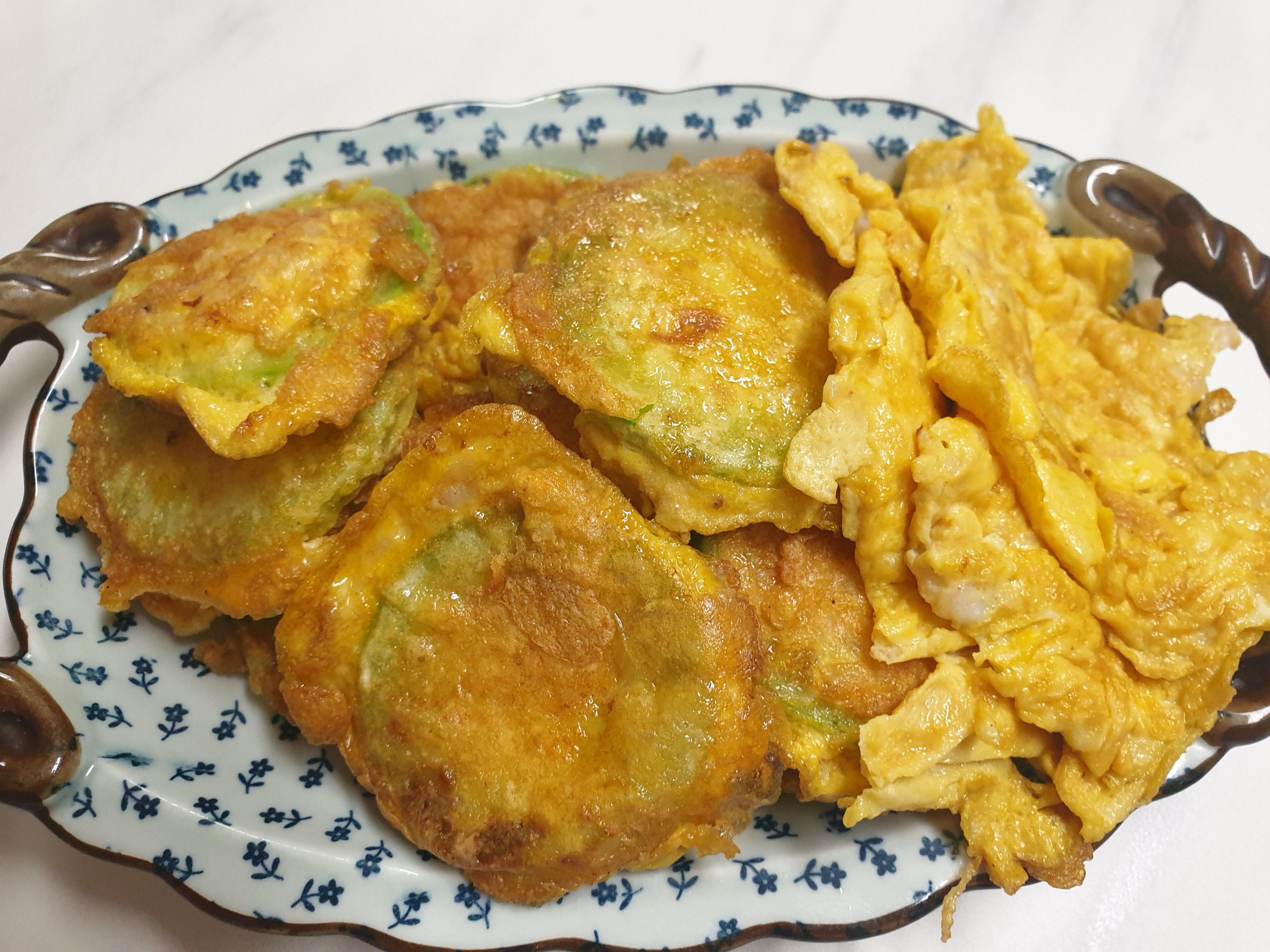 어머니 표 호박전은 작은 새우가 하나씩 올라가는데