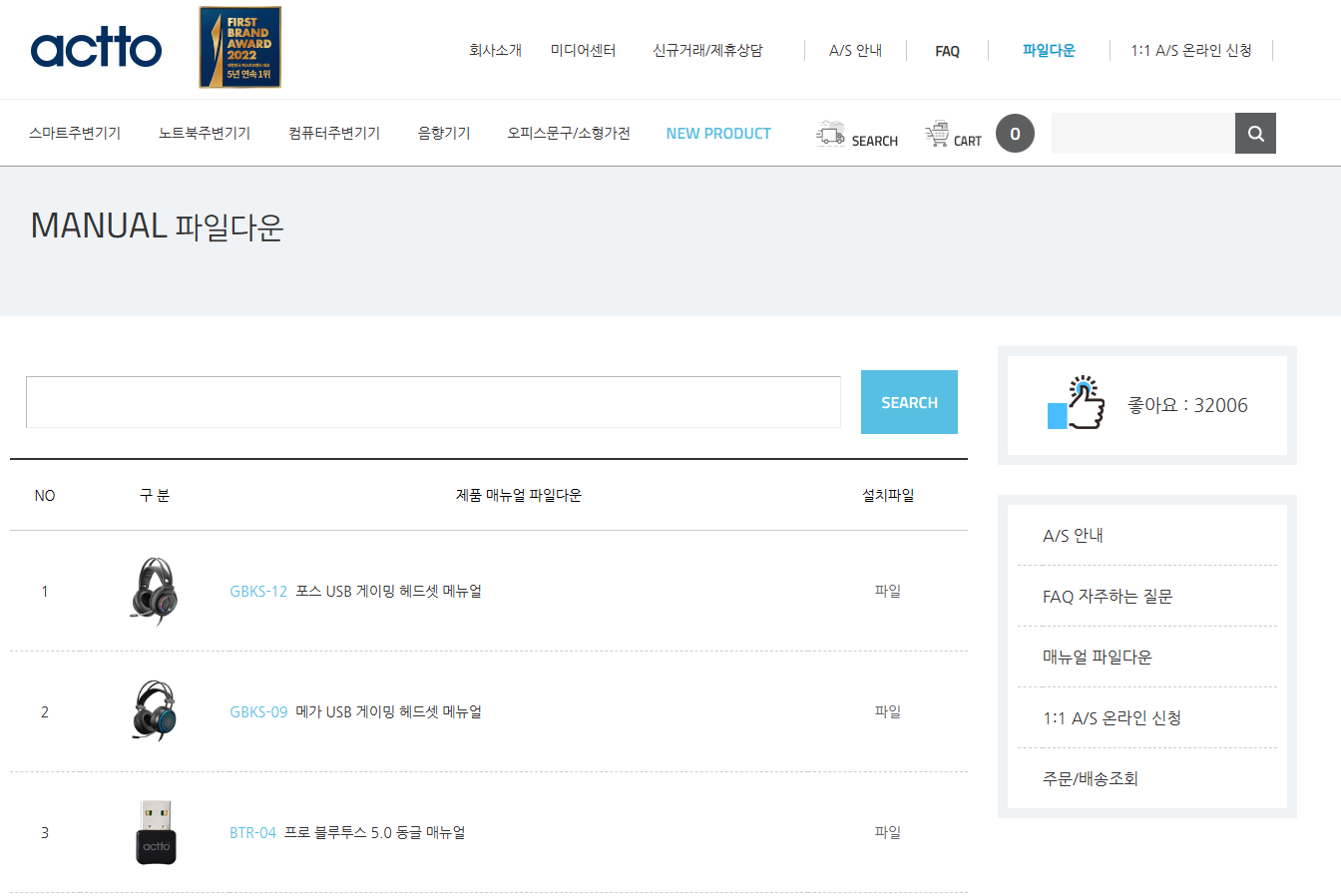 ACTTO 홈페이지에서 오른쪽 위 파일다운을 누르시면