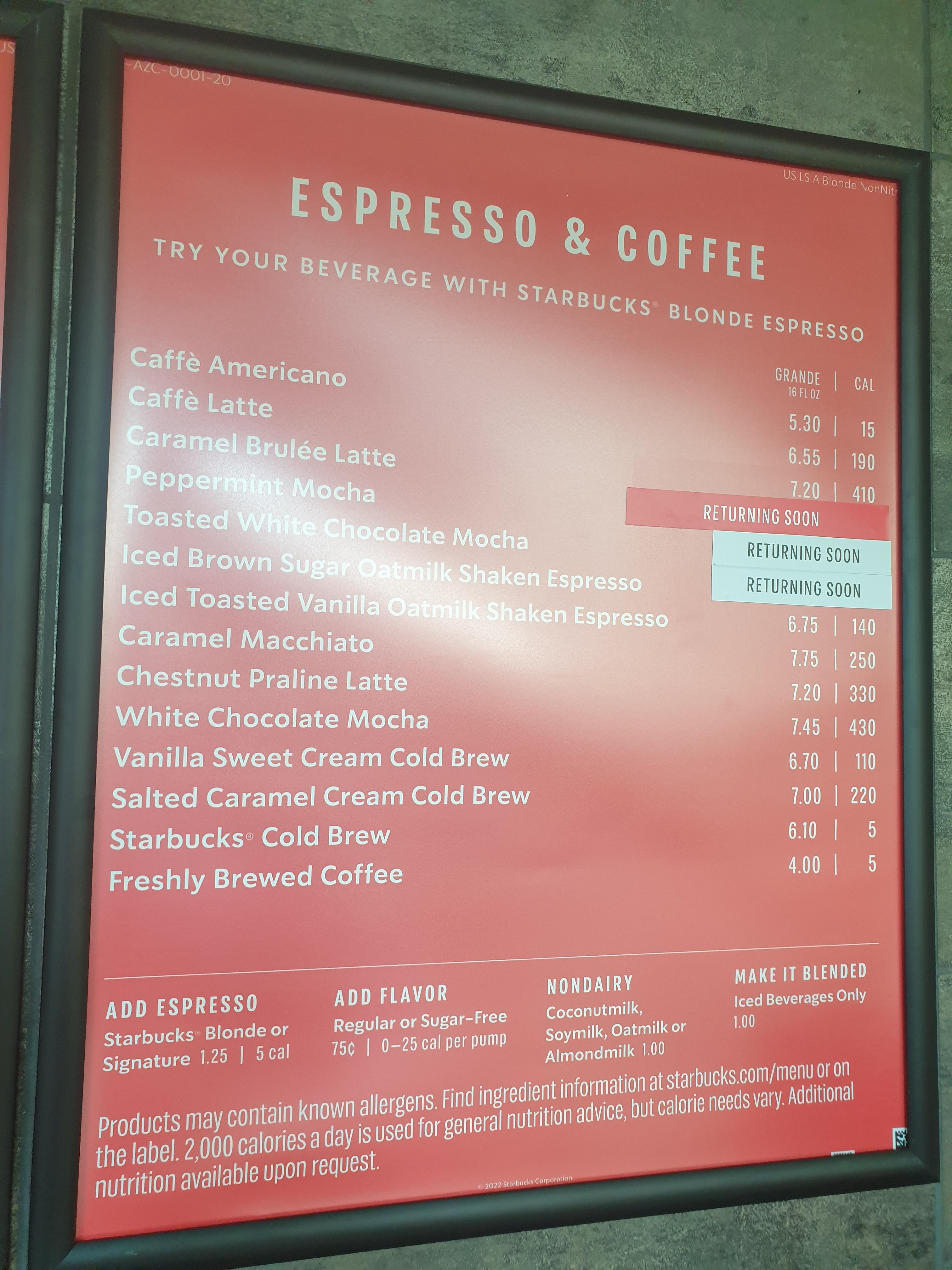 미국 하와이의 스타벅스 메뉴판!