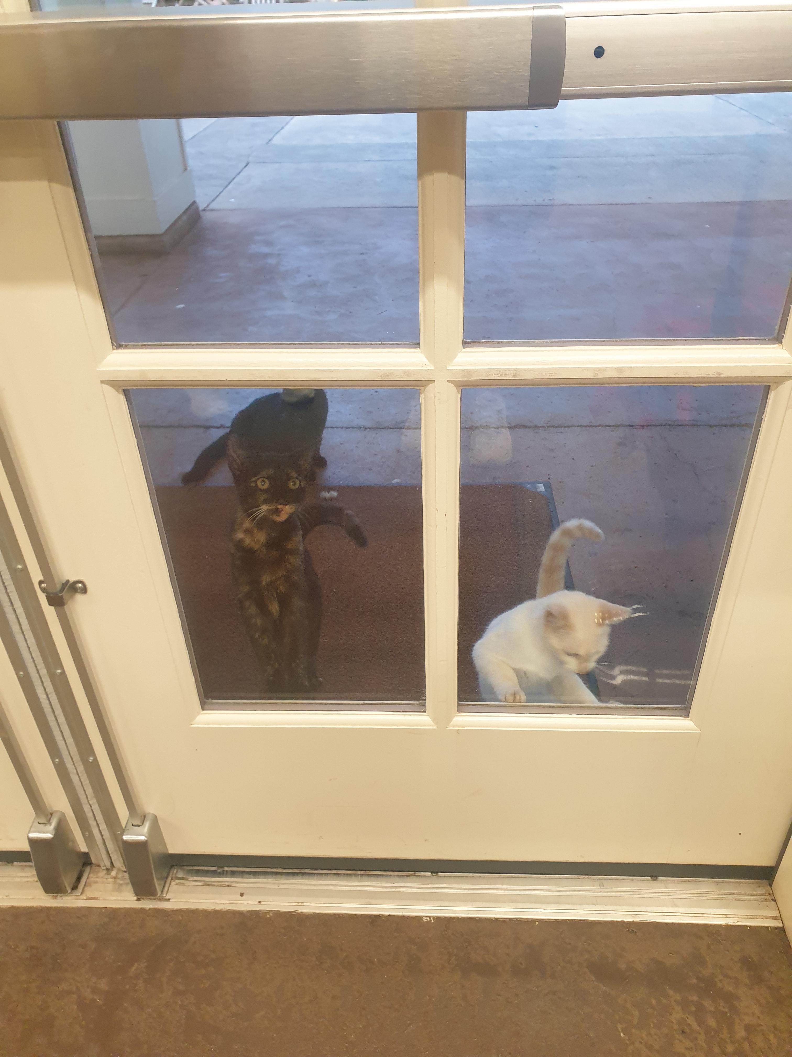 문 앞에 고양이들이 있어요