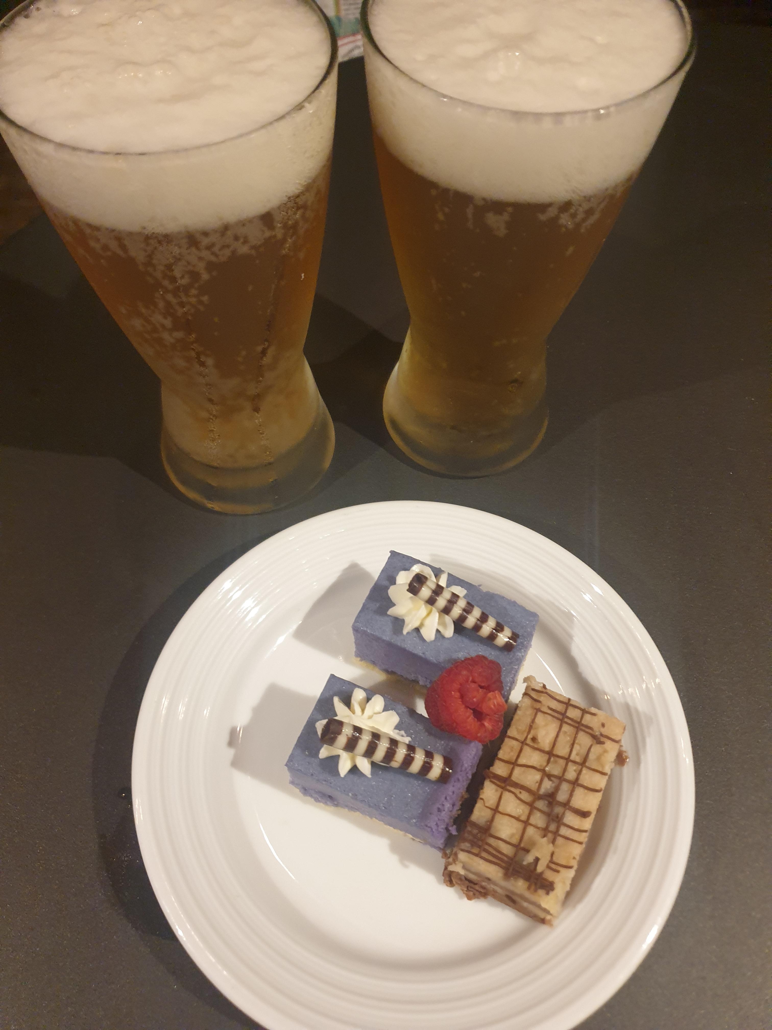 맛있는 조각 케이크를 안주 삼아서 맥주를 먹으며