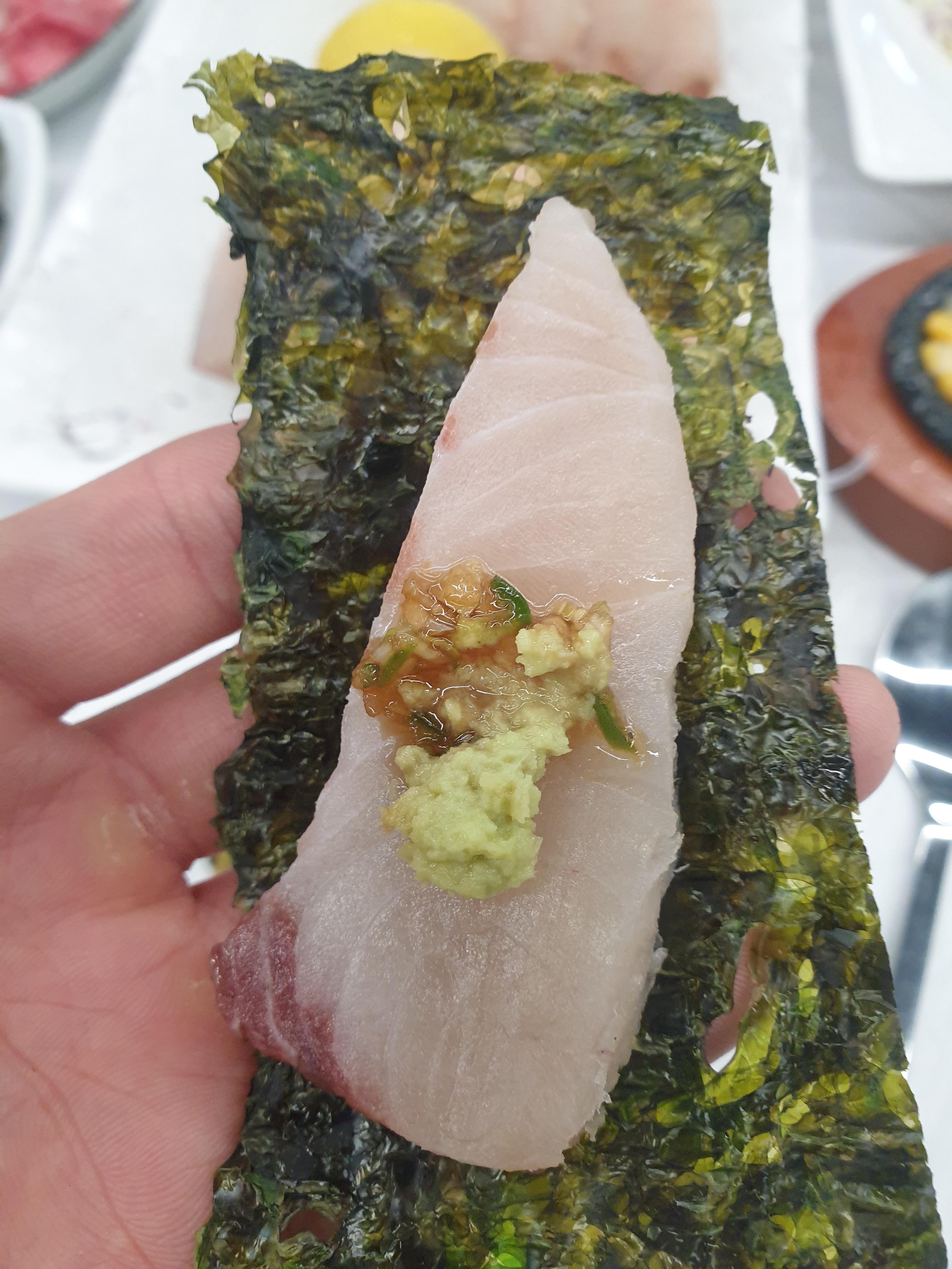 선어회가 나오자 김에다 싸도 드시구