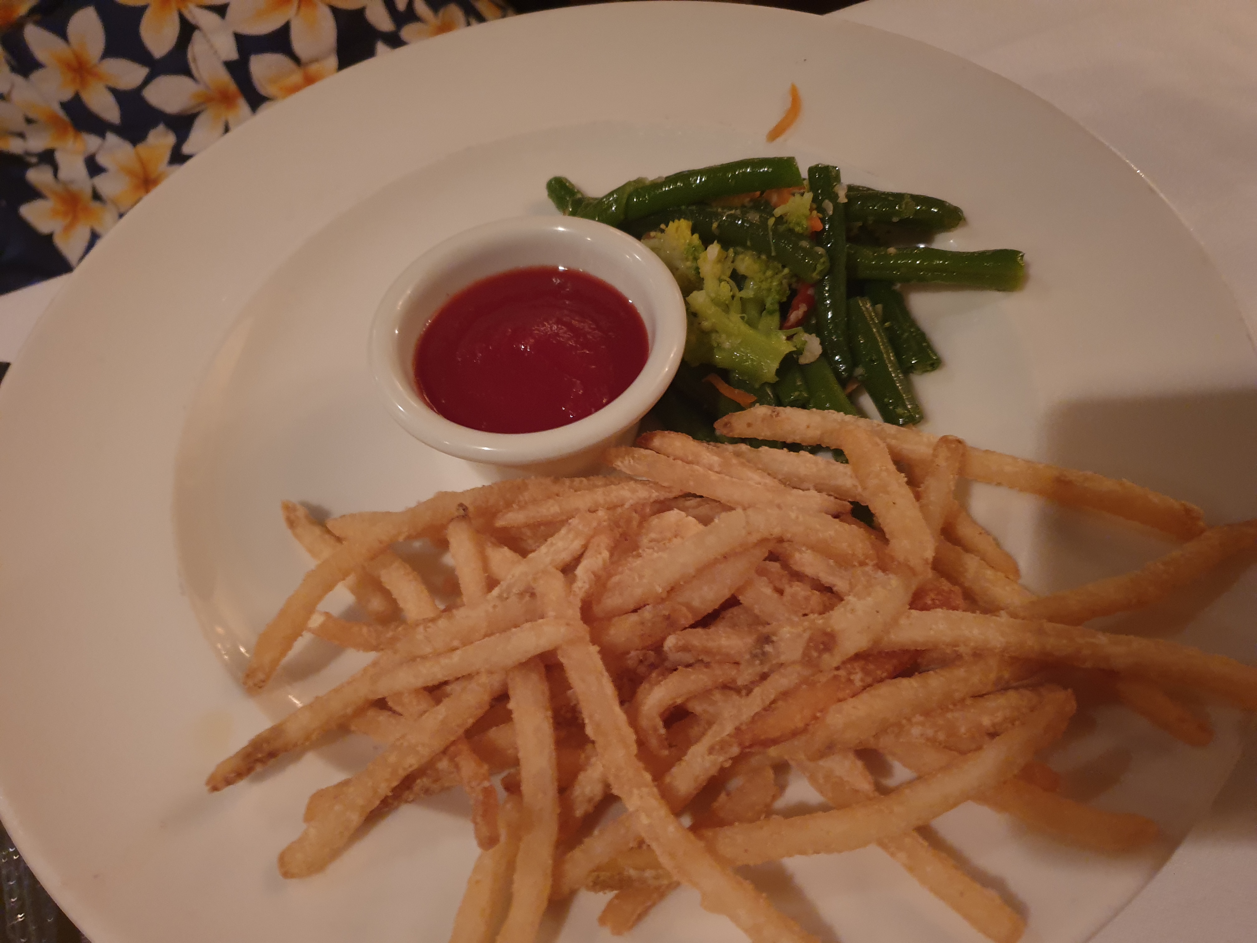 야채와 메쉬드 포테이토, 감자튀김과 소스는