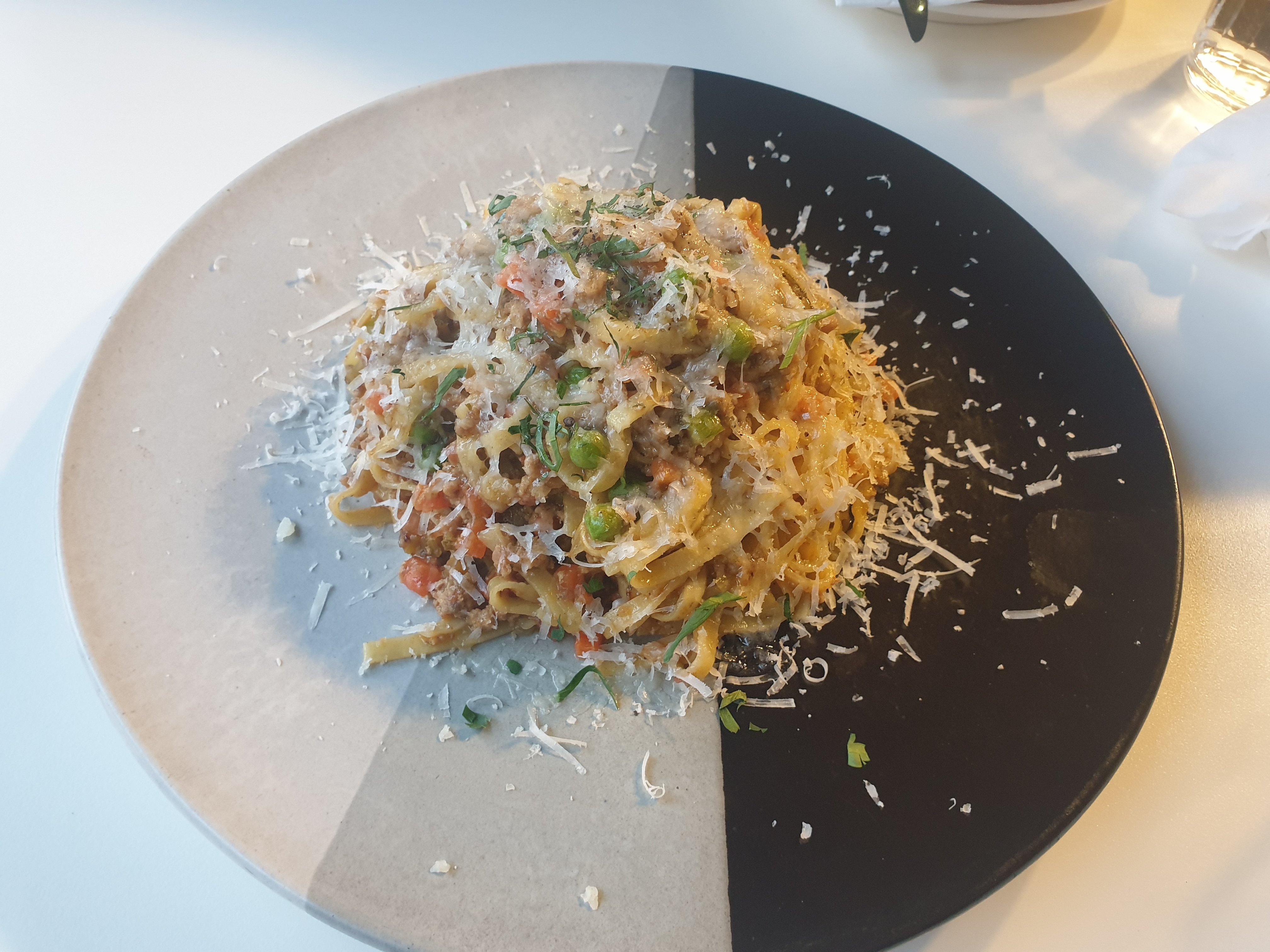 진한 고기 육수로 만든 파스타 라구 비앙코