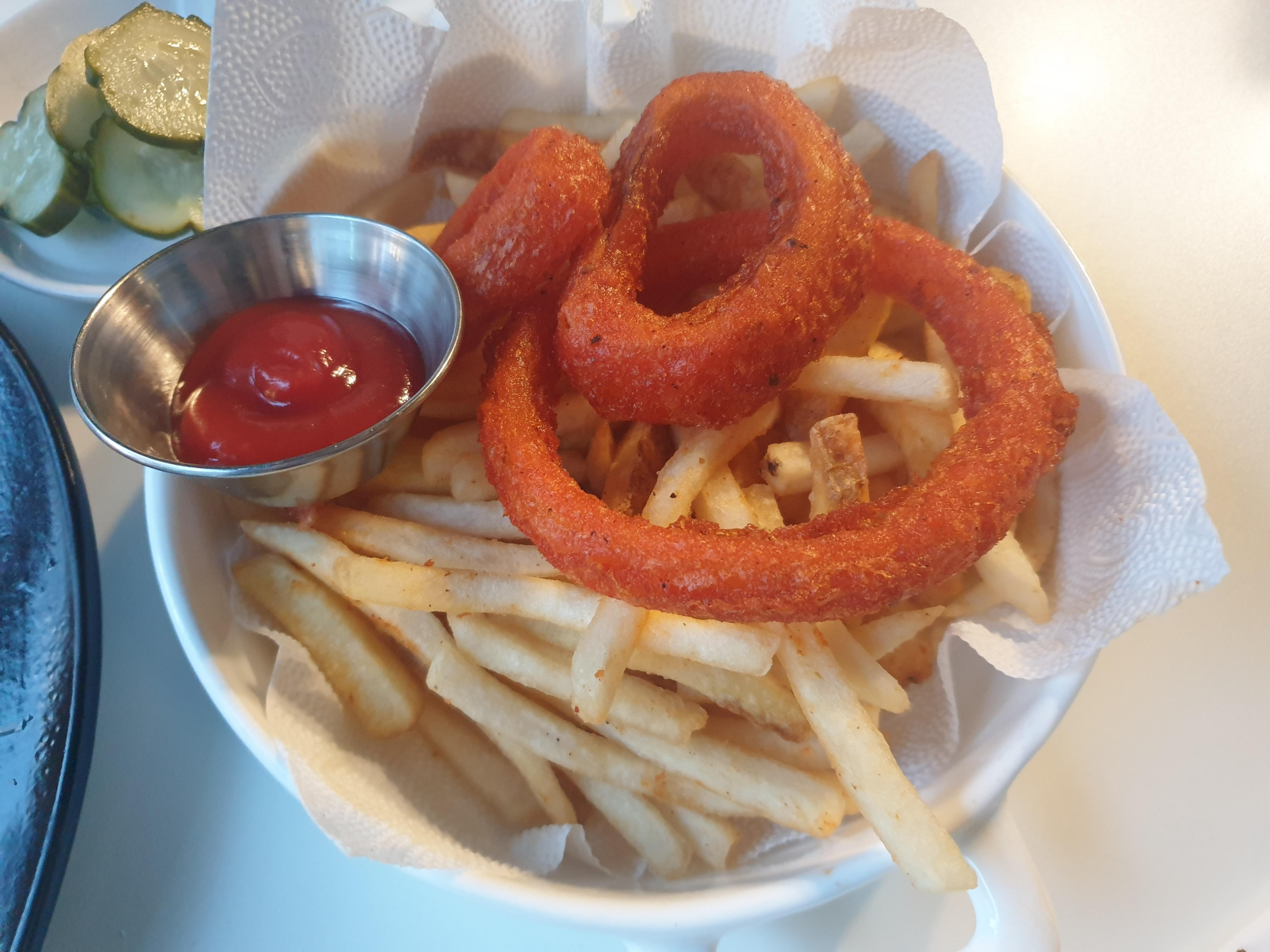 사이드메뉴는 어니언 링이랑 감자튀김입니다