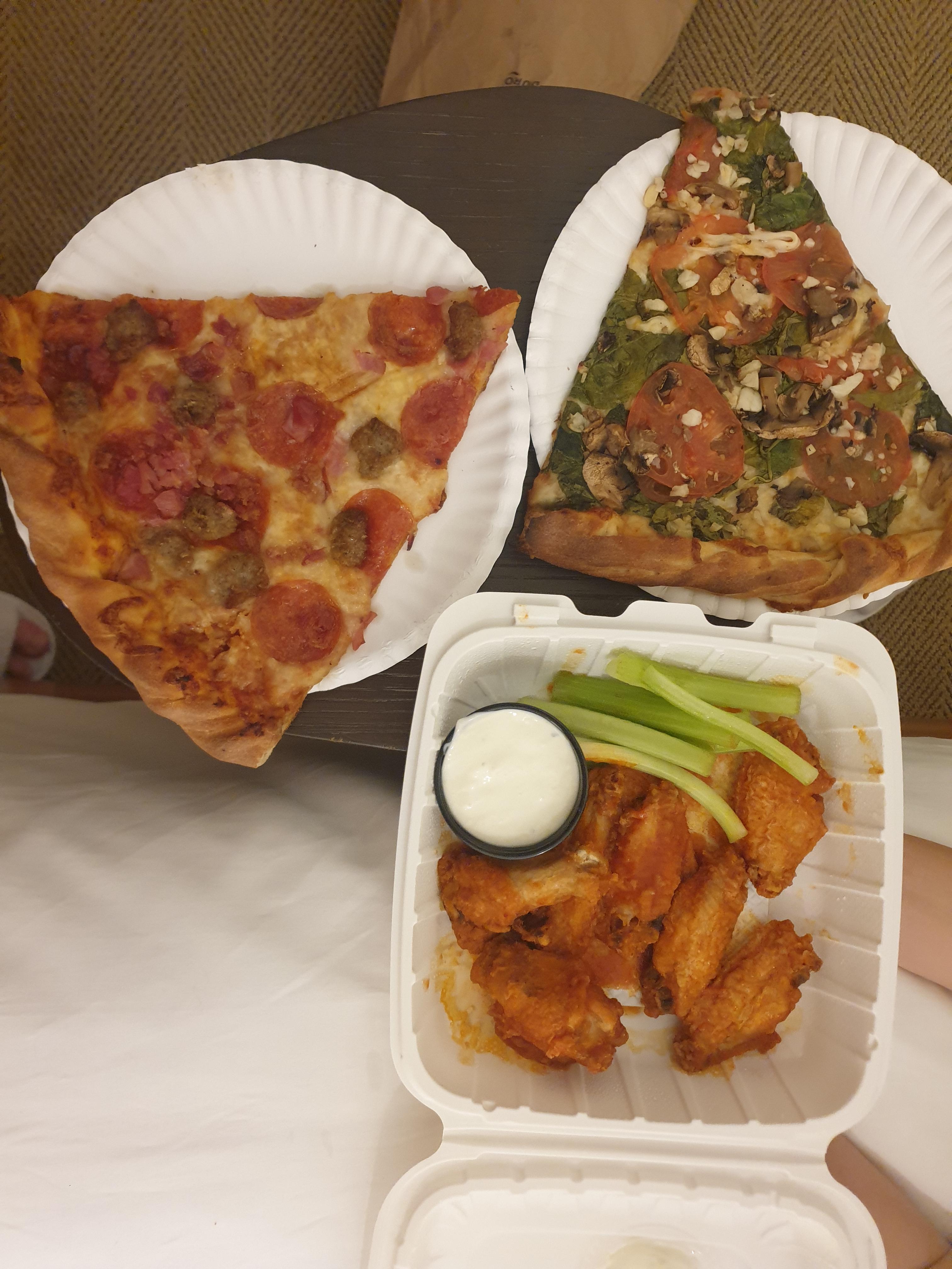 주문한 메뉴는 피자 두 조각과 버팔로윙입니다