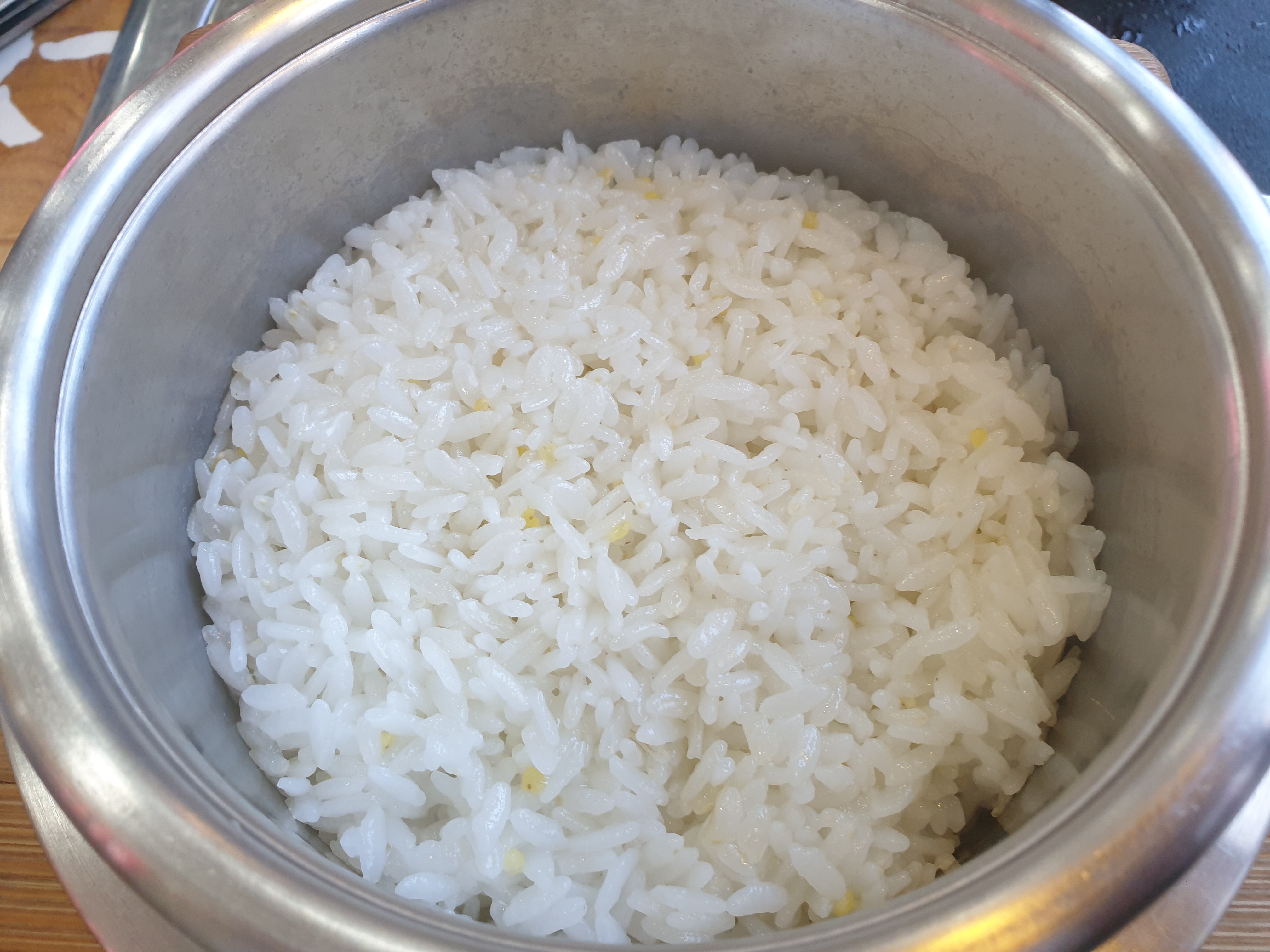 솥밥 안에 있는 밥을 덜어낸 다음 뜨거운 물을 부어요