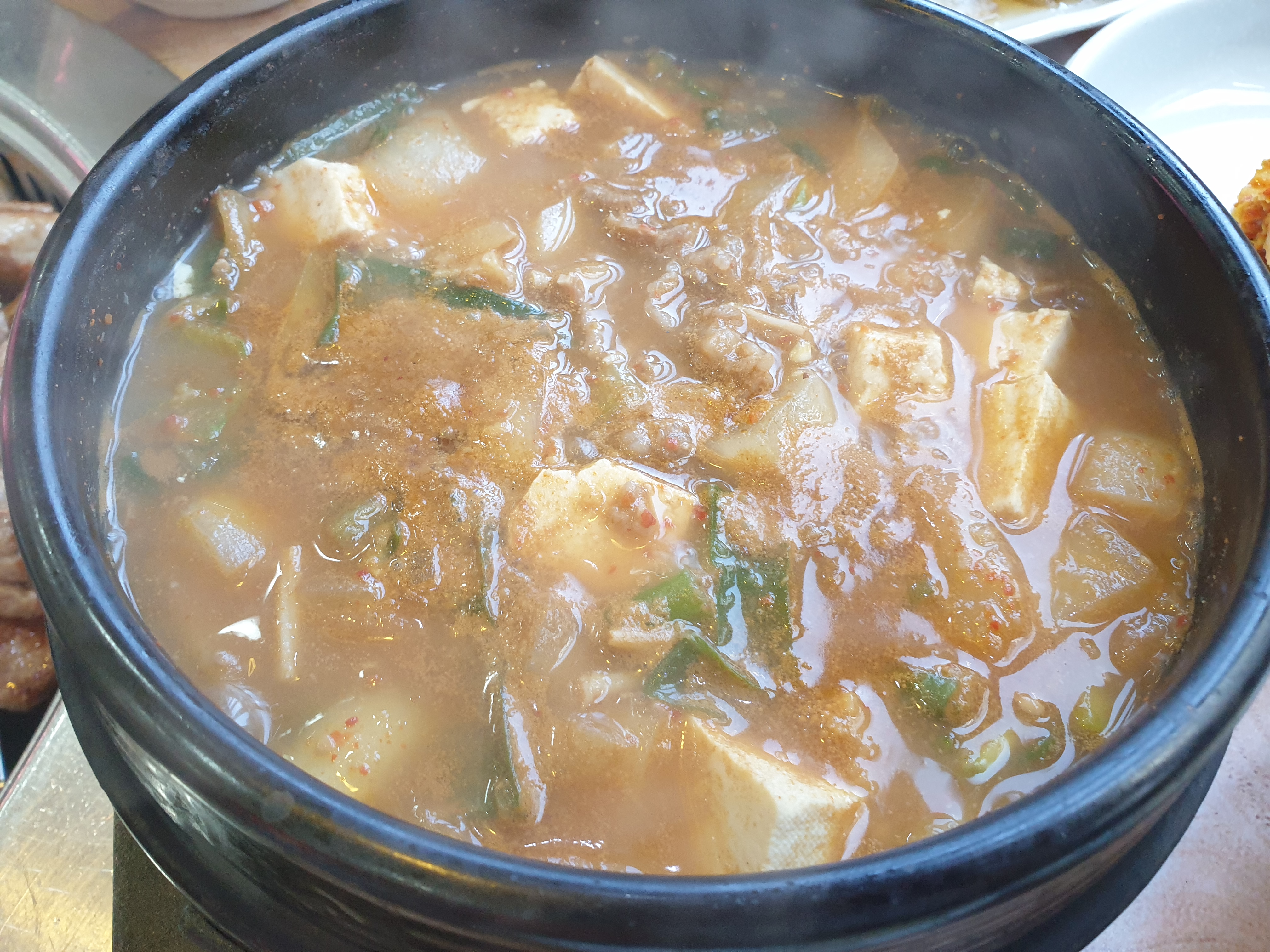 된장찌개에는 고기와 채소가 듬뿍 들어있어서 좋구