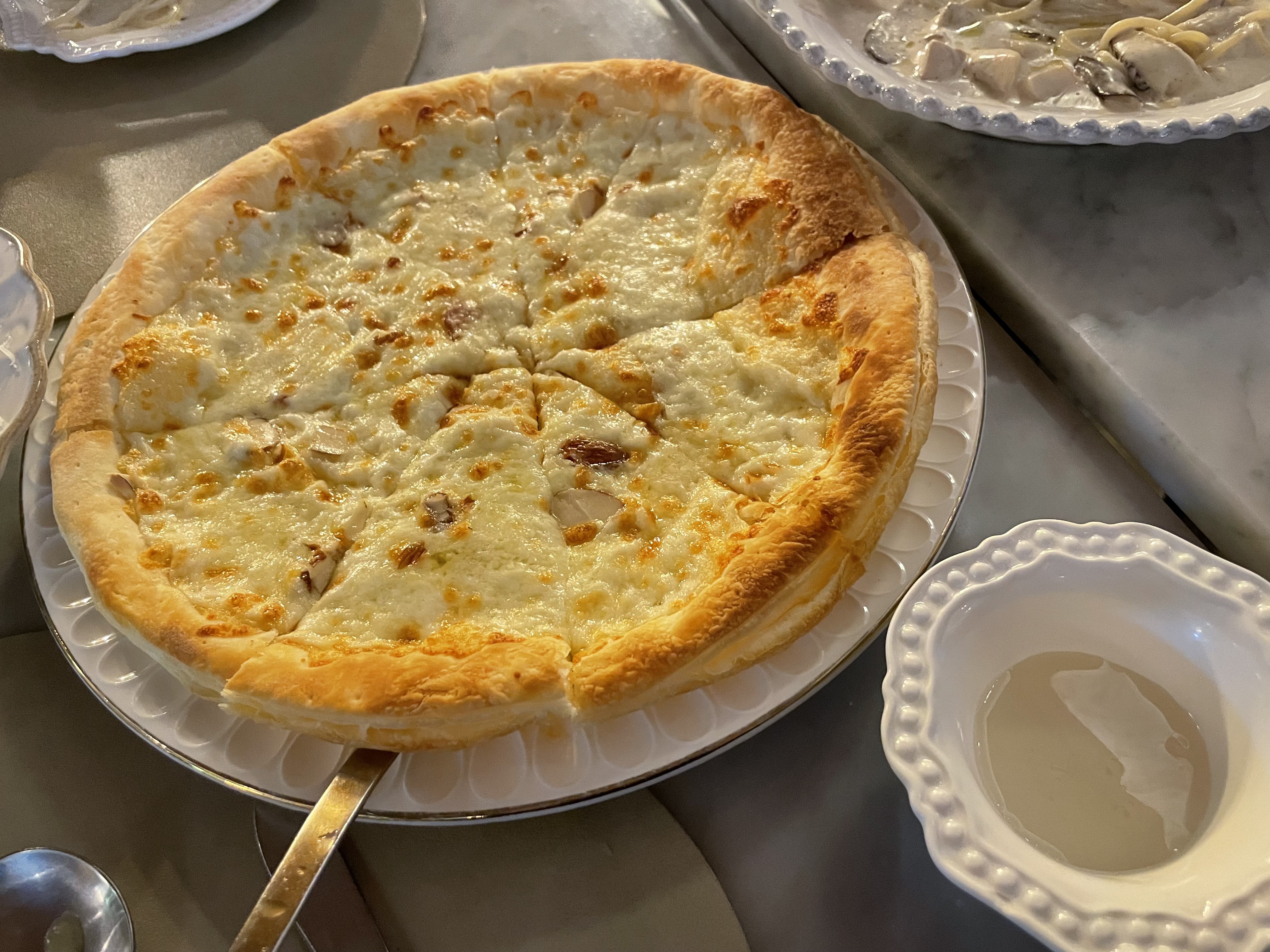 모짜렐라 치즈와 고르곤치즈가 들어가는 피자죠