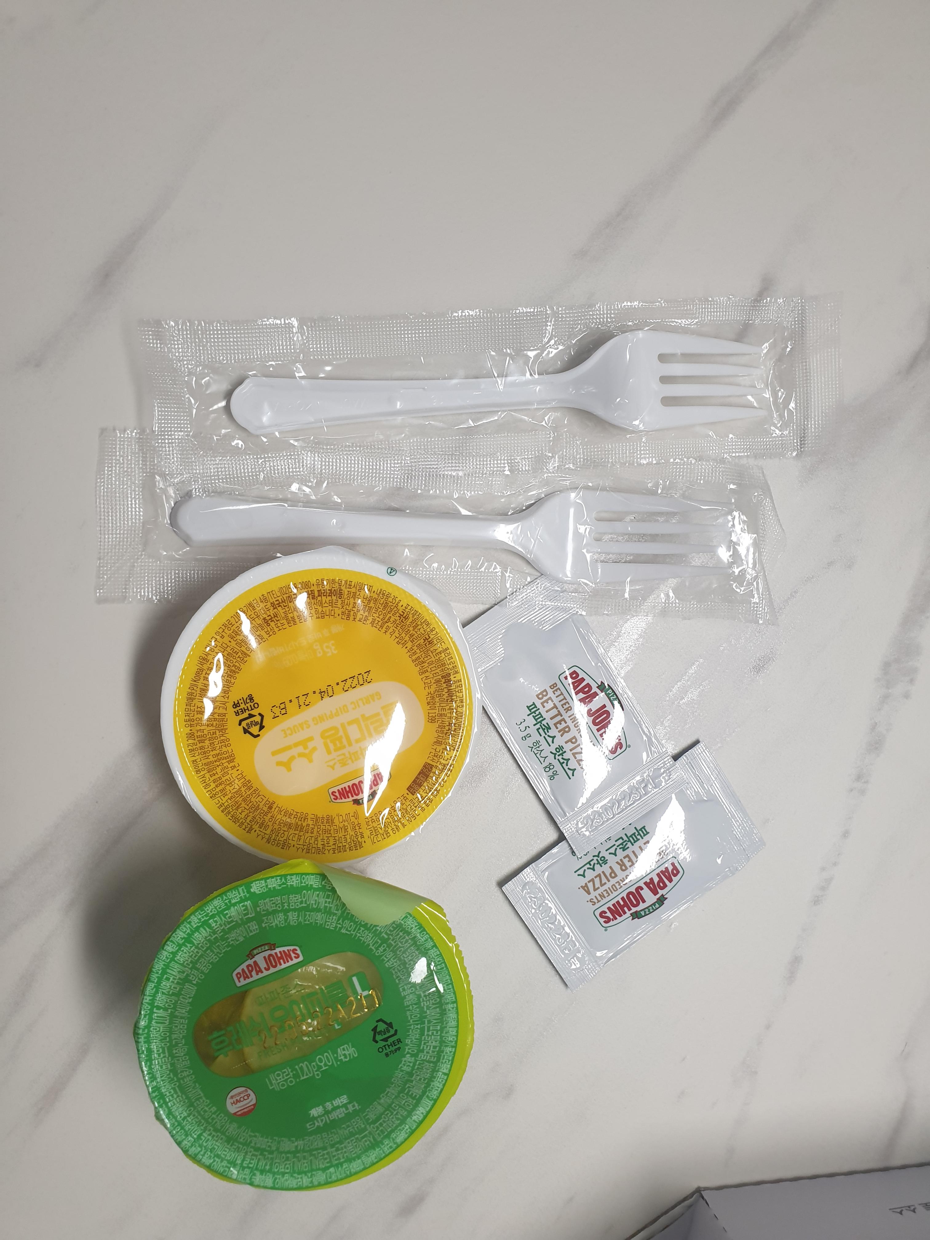 포크와 딥핑 소스 피클, 핫소스도 왔어요
