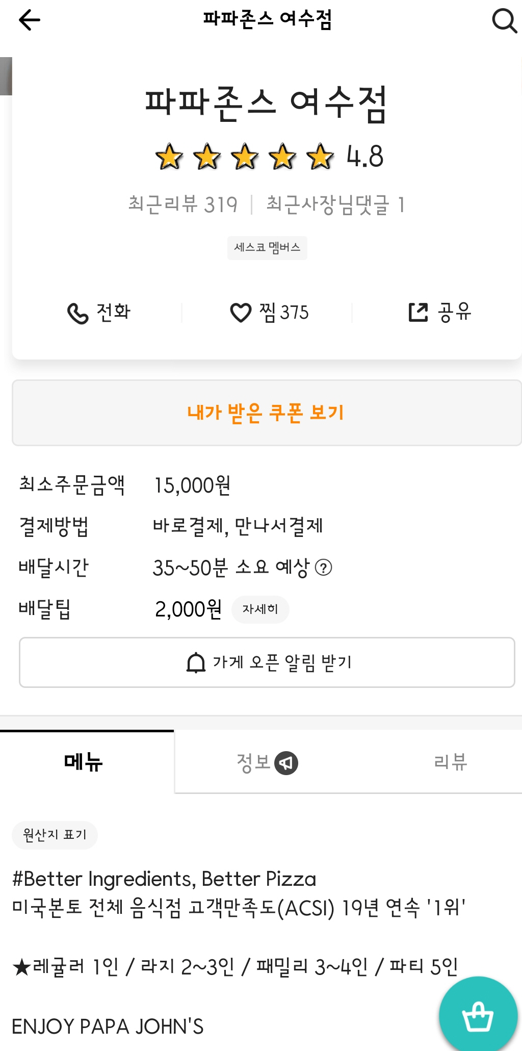 그래서 먹어보지 않았던 파파존스를 시키기로 합니다
