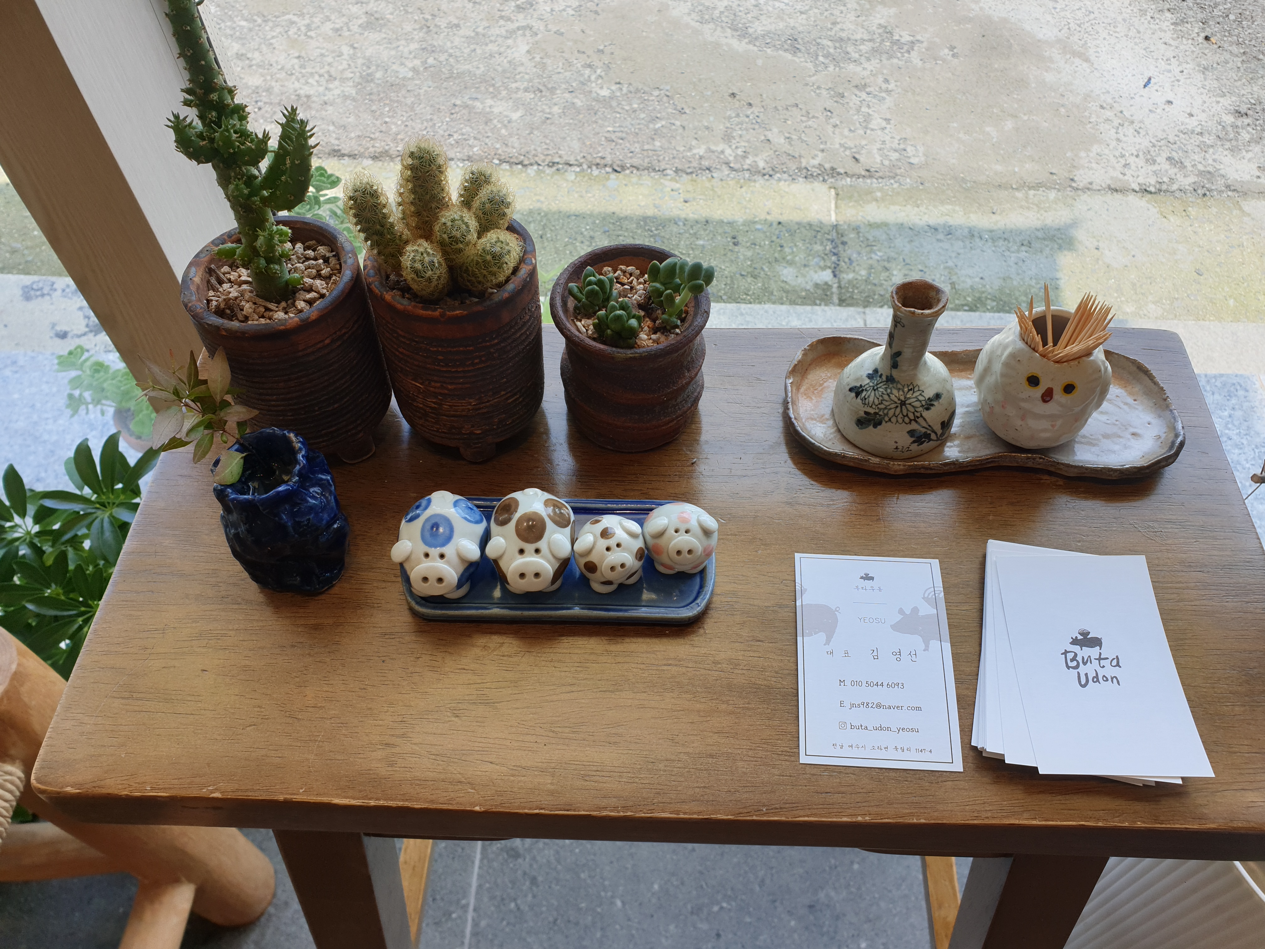 귀엽게 세팅되어있는 화분과 이쑤시개, 명함입니다