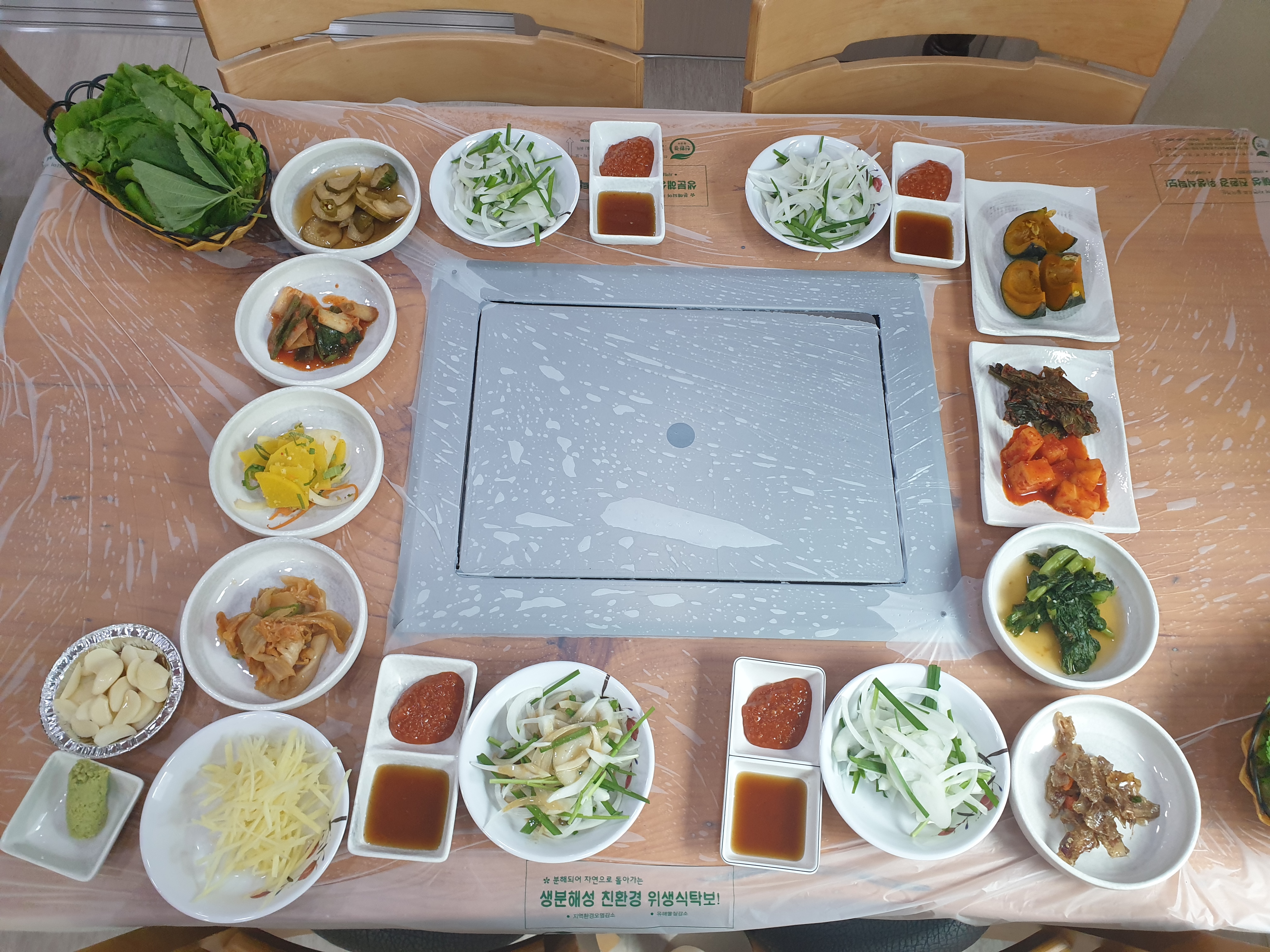 자리에 앉자 하나하나 밑반찬이 깔려요