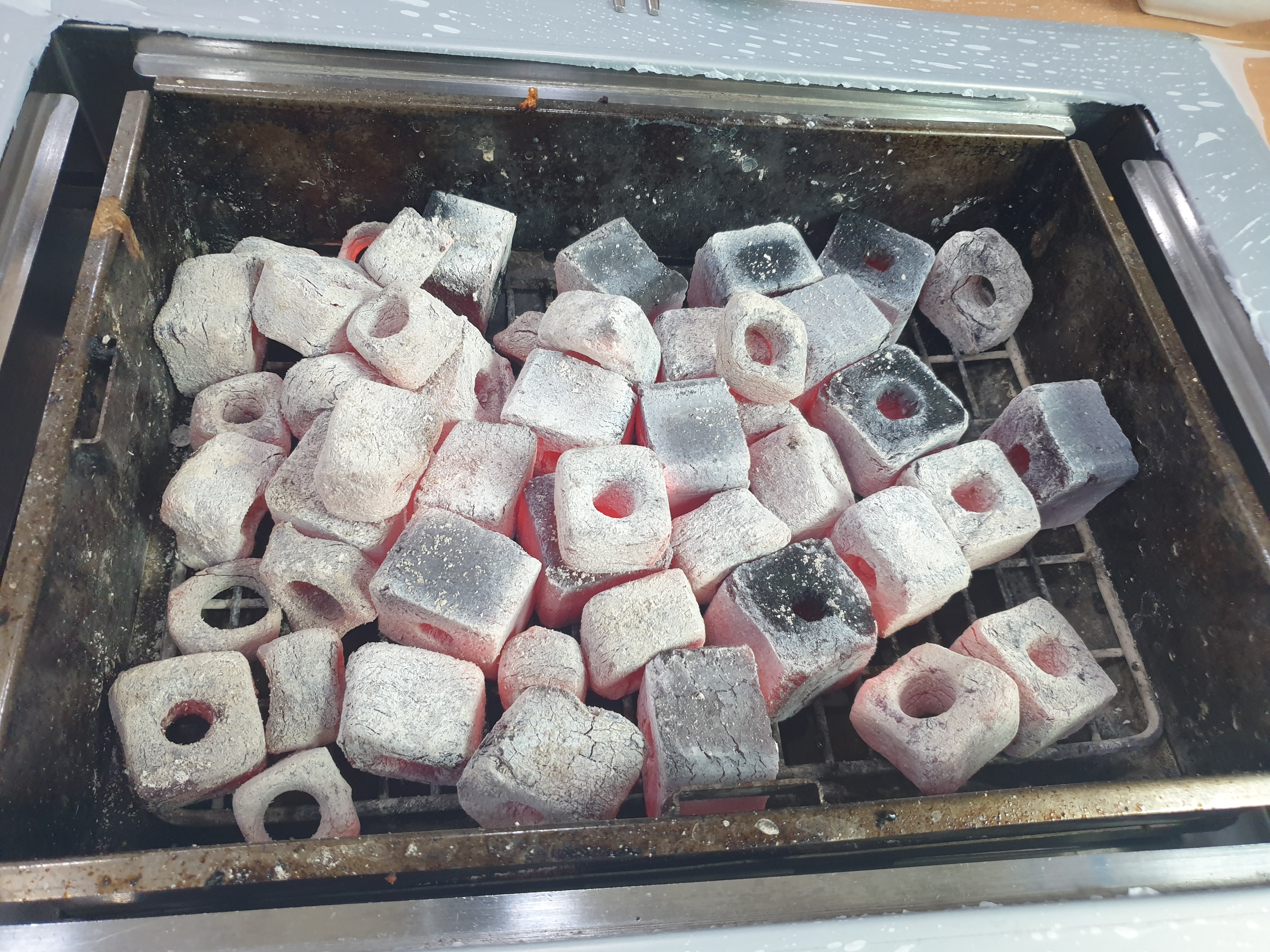 조금 기다리니 네모 네모난 숯이 들어왔어요