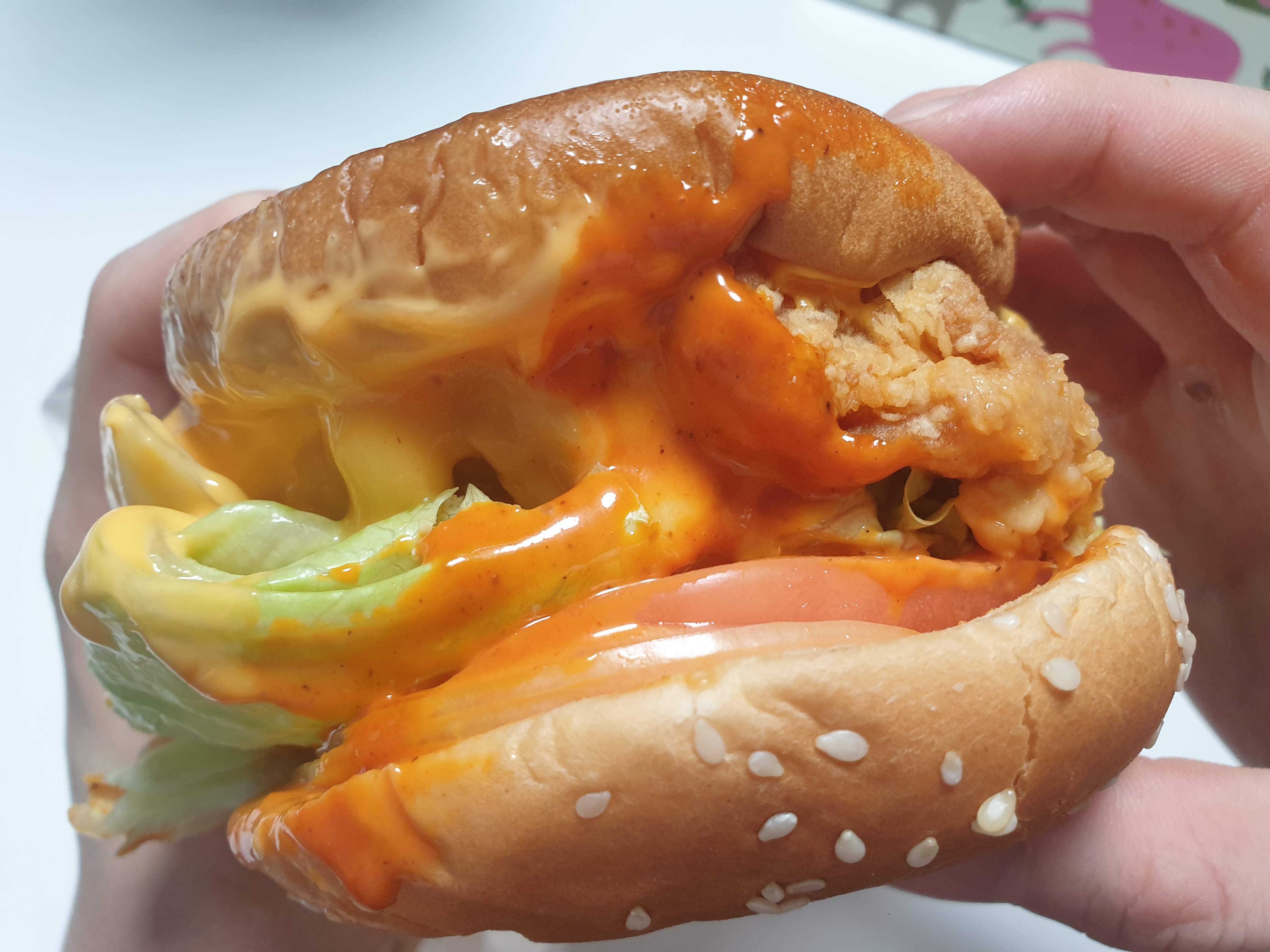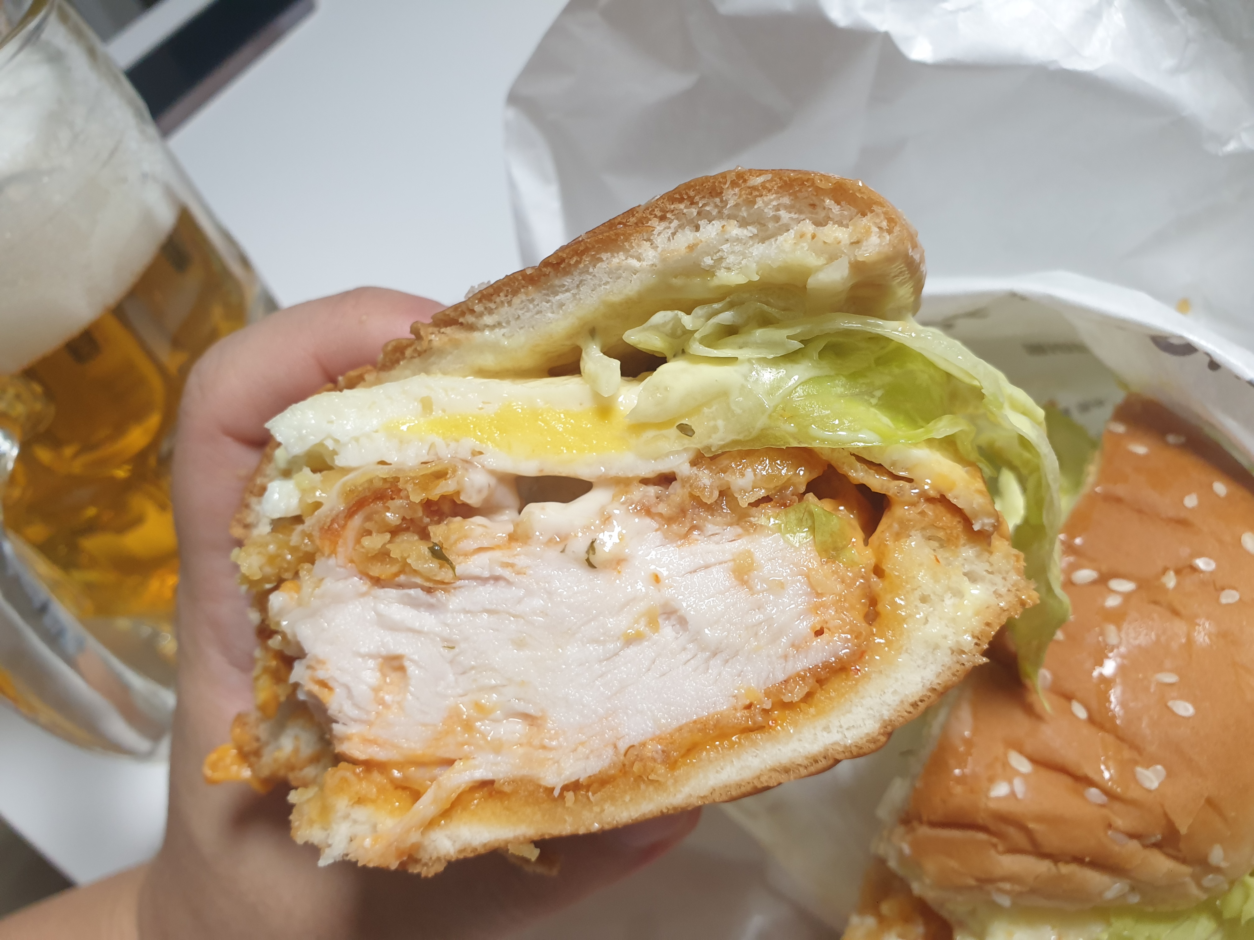 두툼한 통다리살 패티가 들어있는 버거입니다