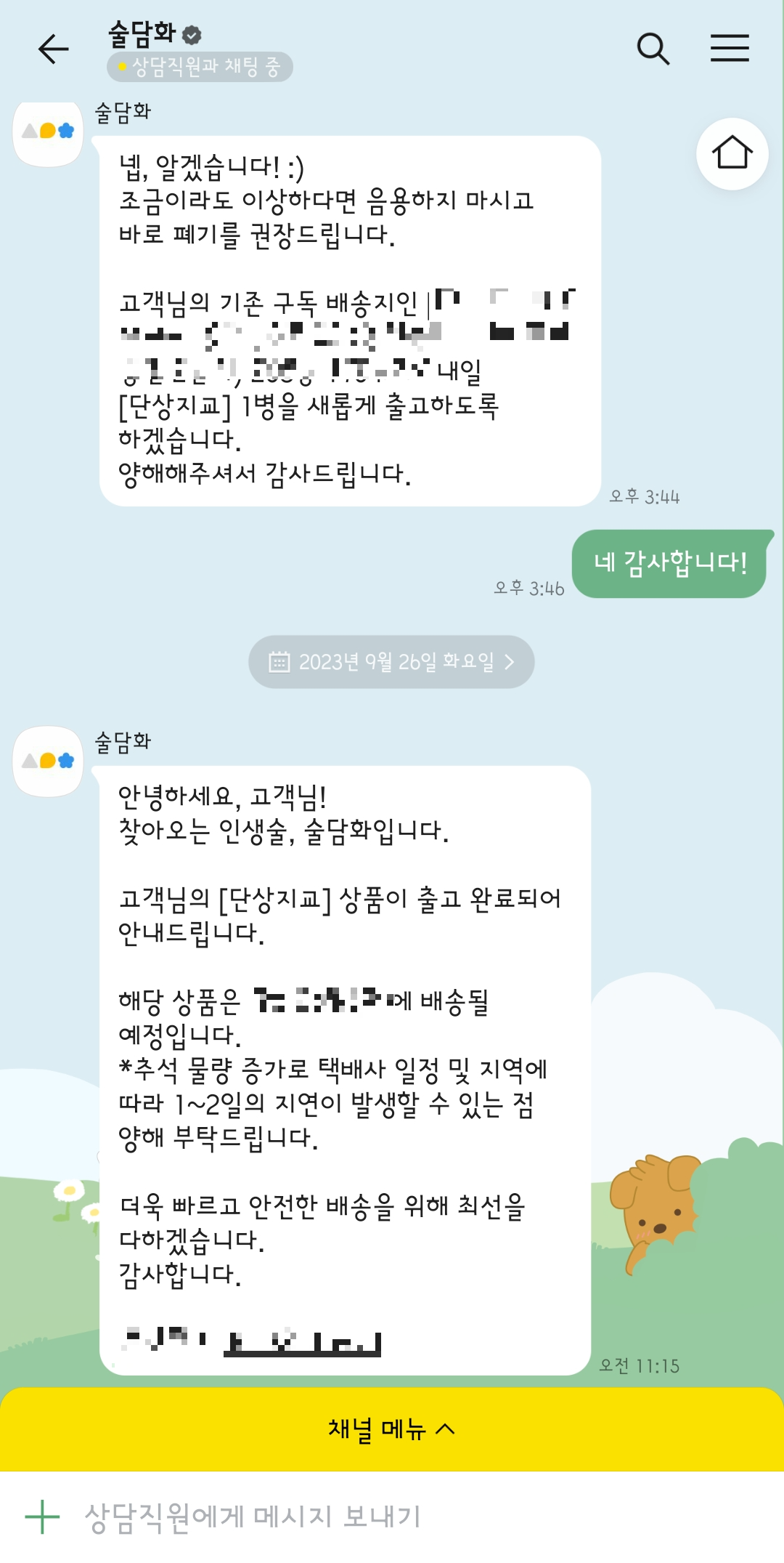 술담화 고객센터의 빠르고 만족스러운 대응에 감사하여 남기는 후기