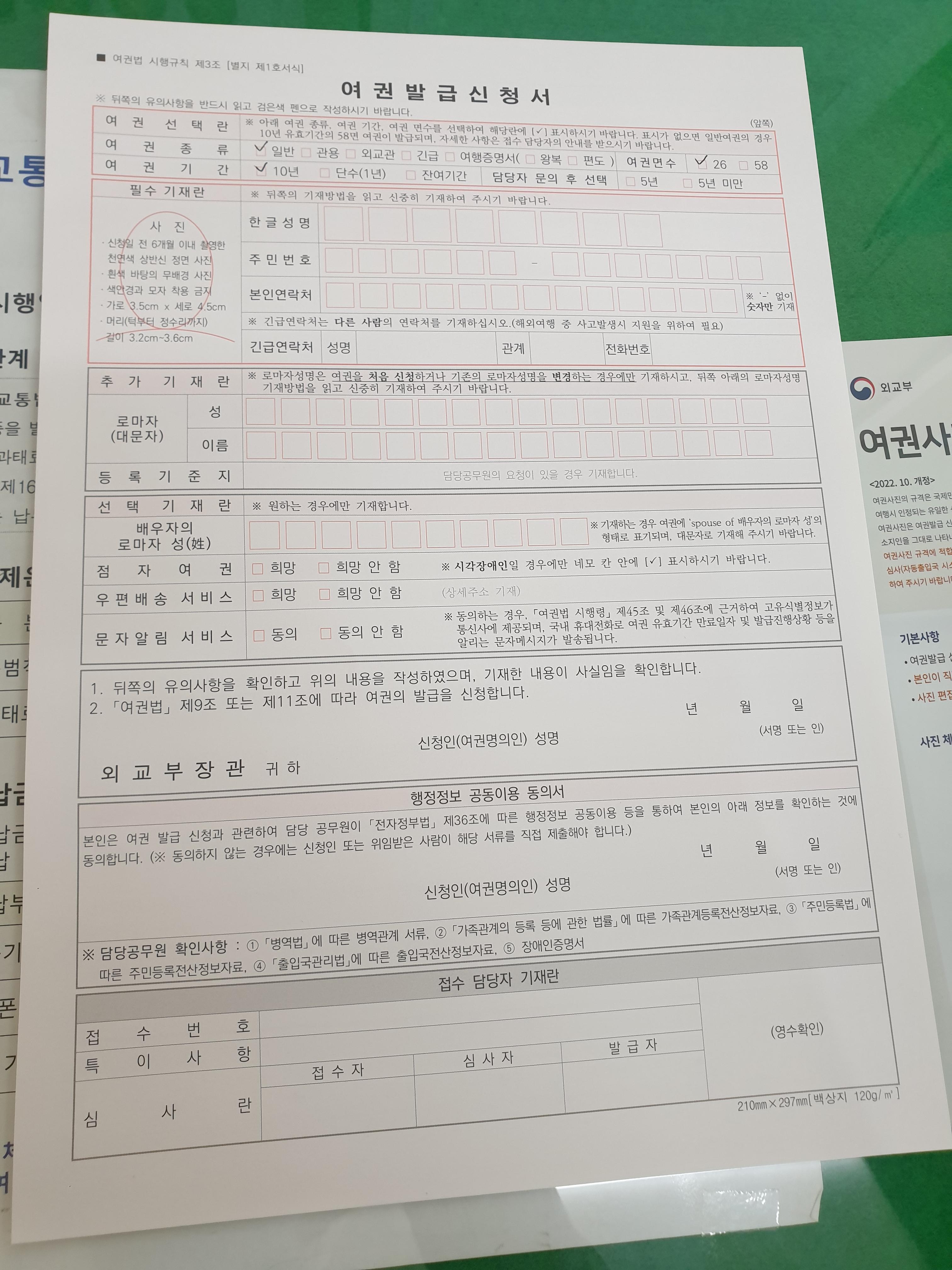 자리에 앉자 여권발급신청서 종이를 주셨구요