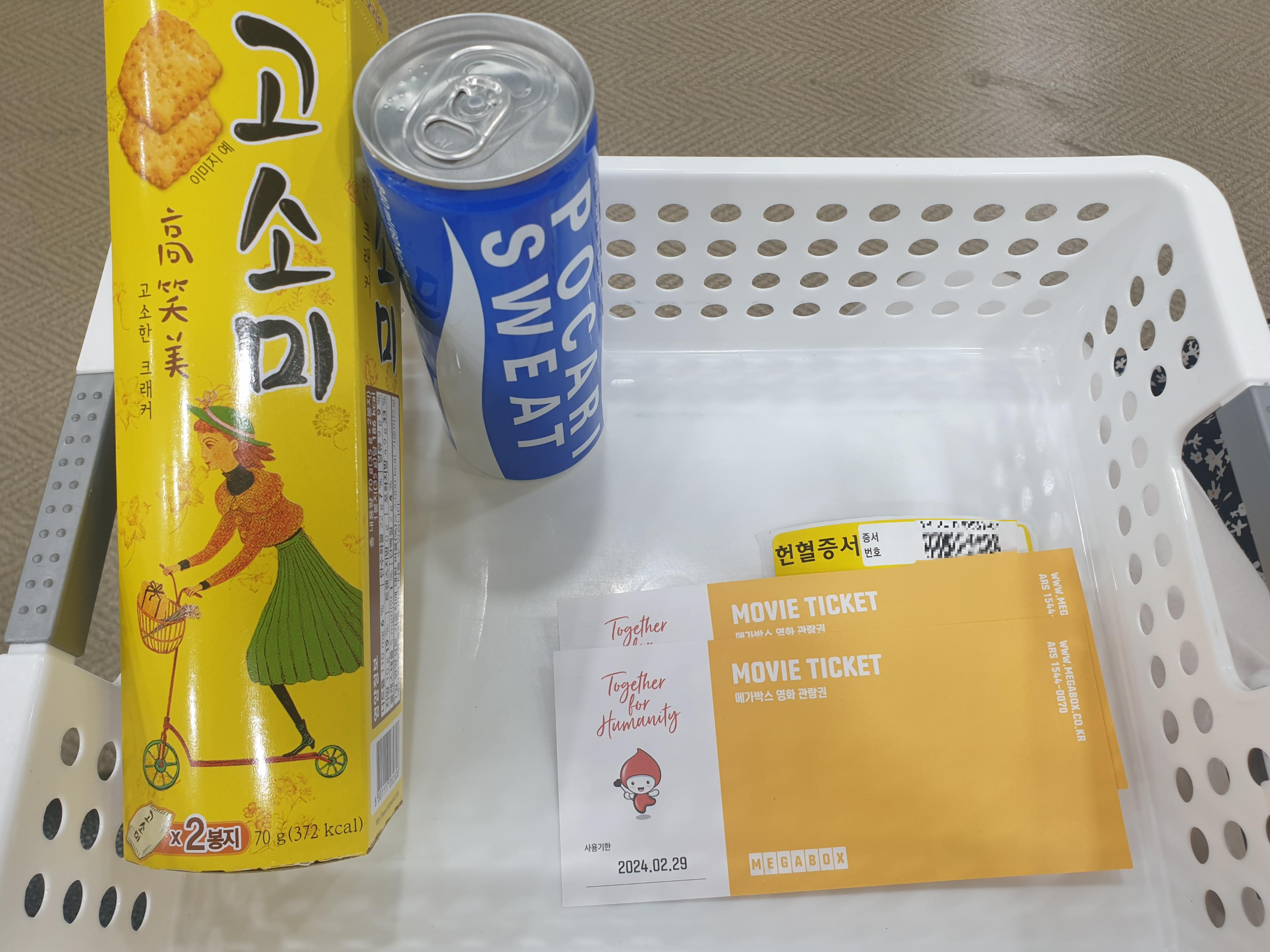 그때 과자랑 음료수, 헌혈 기념품과 증서를 받았어요