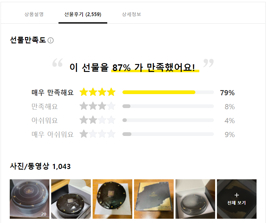 선물 만족도는 87%가 만족하다고 적어주셨네요