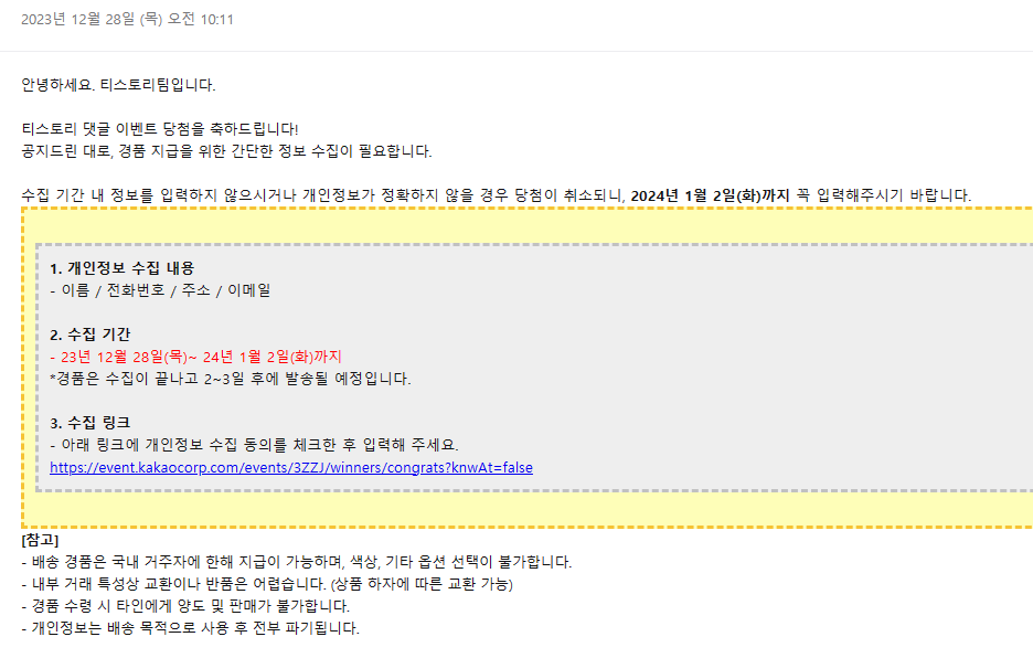 티스토리가 댓글 이벤트를 했을 때 참여해서 당첨된 후기입니다