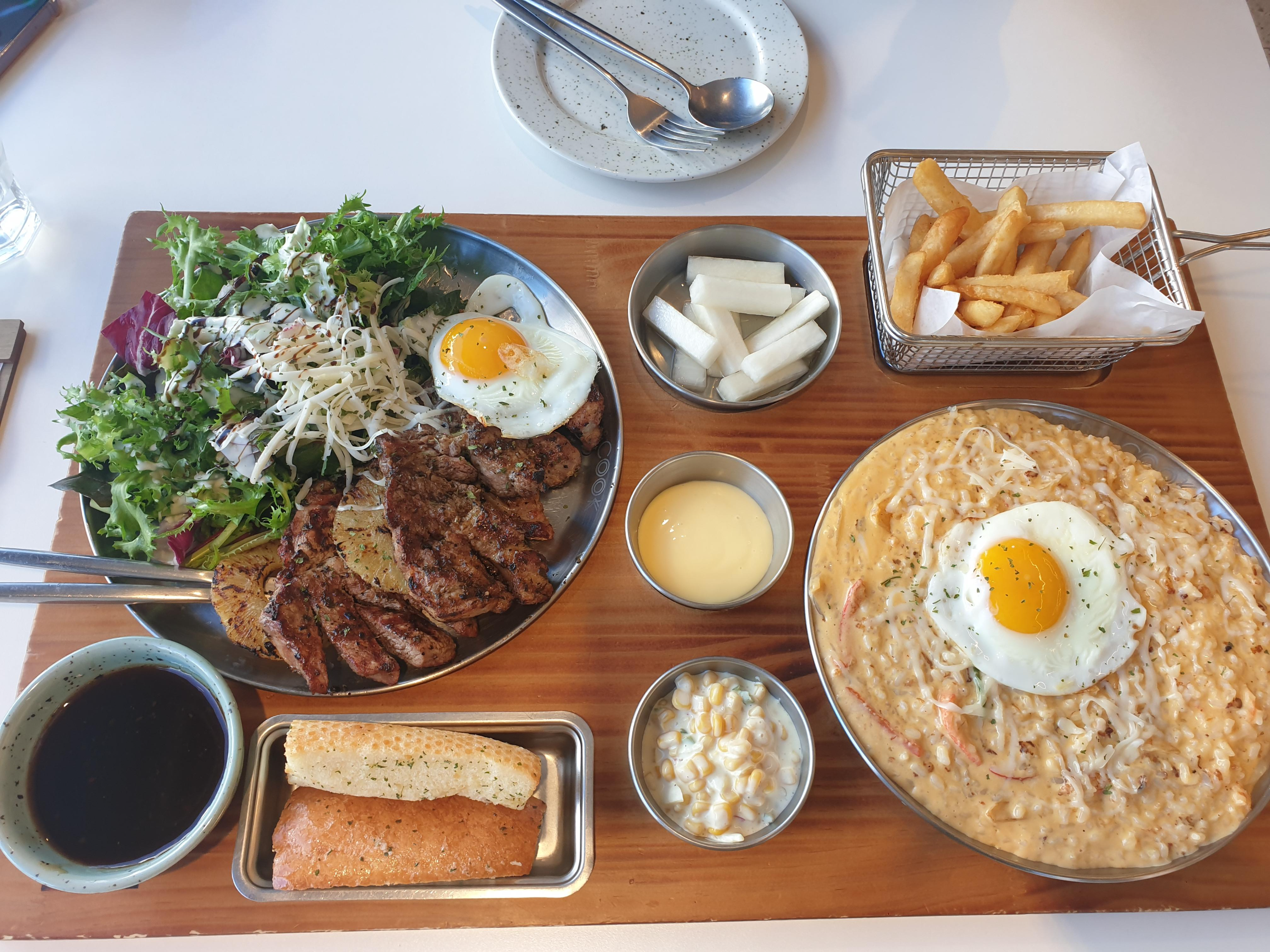 거기서 목살 한상과 게살 오이스터 리조또를 골라요