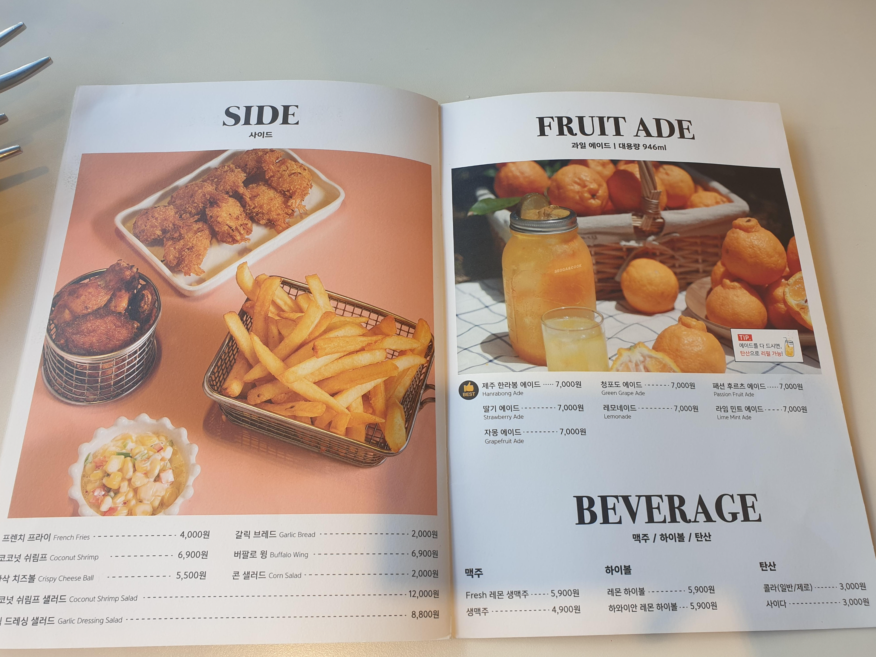 서가앤쿡의 메뉴판입니다