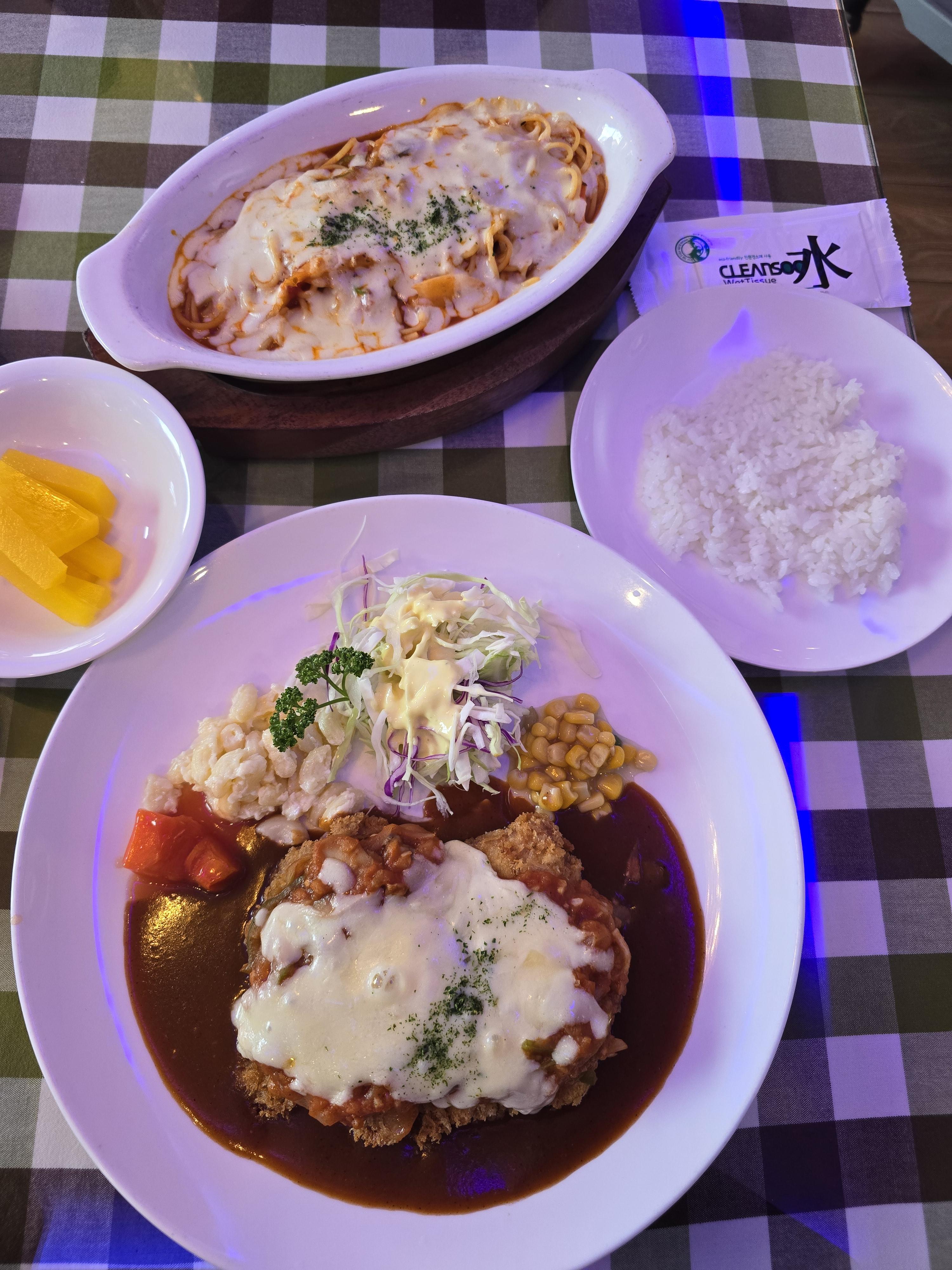 이탈리안 돈까스와 치즈오븐스파게티입니다