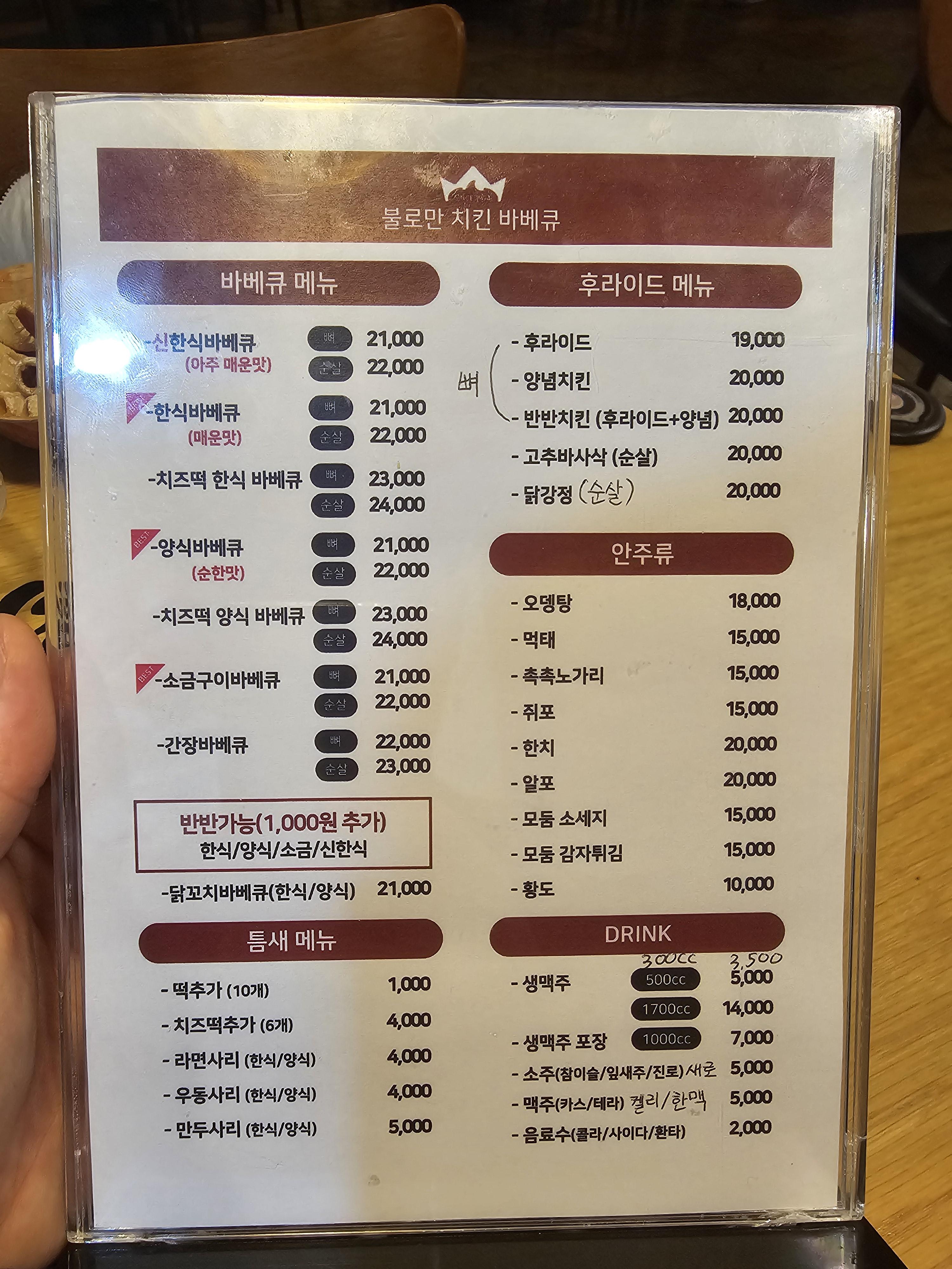 불로만 치킨 바베큐 메뉴판