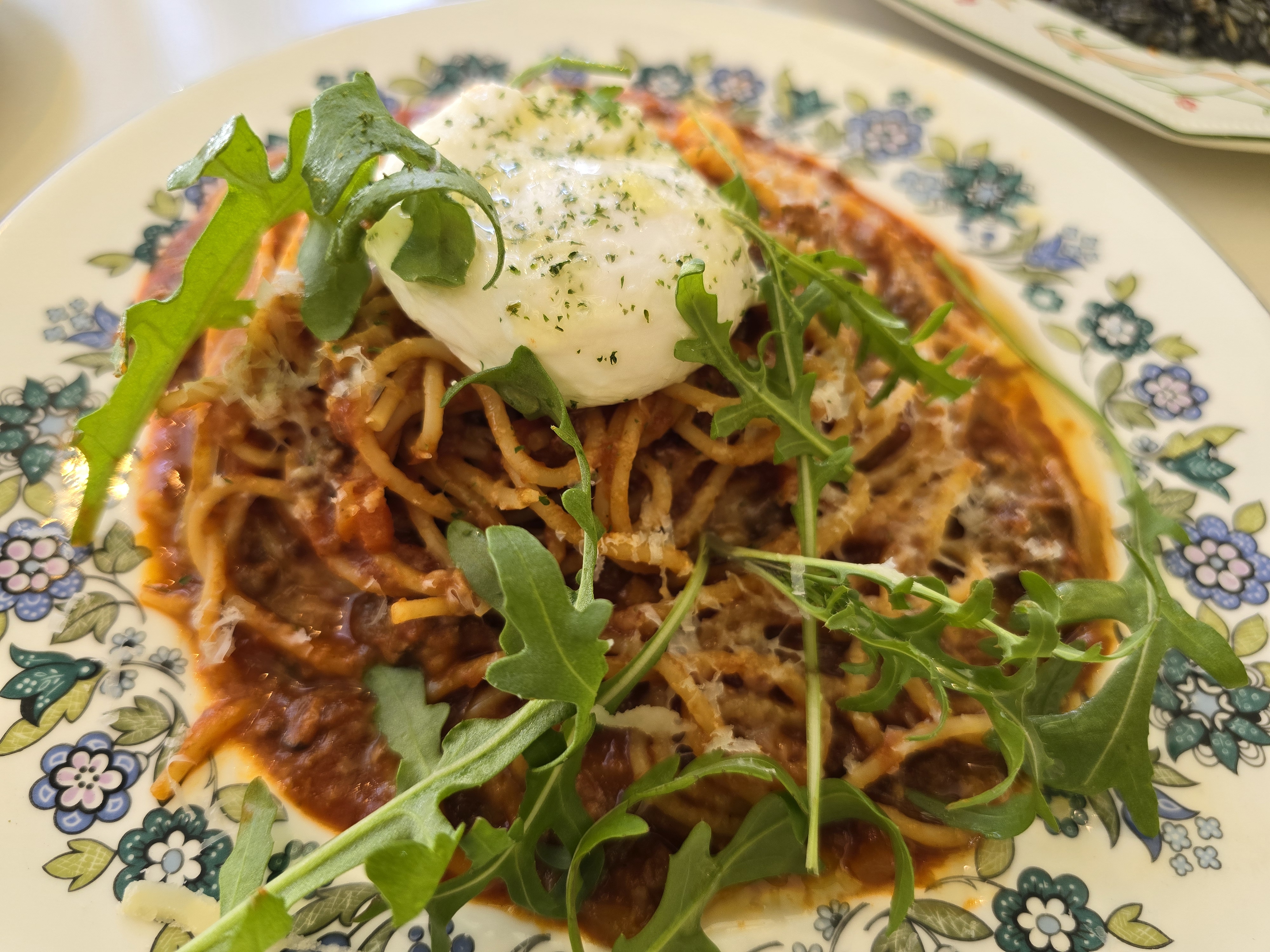 라구 토마토 파스타입니다 수란이 올라가 있어요