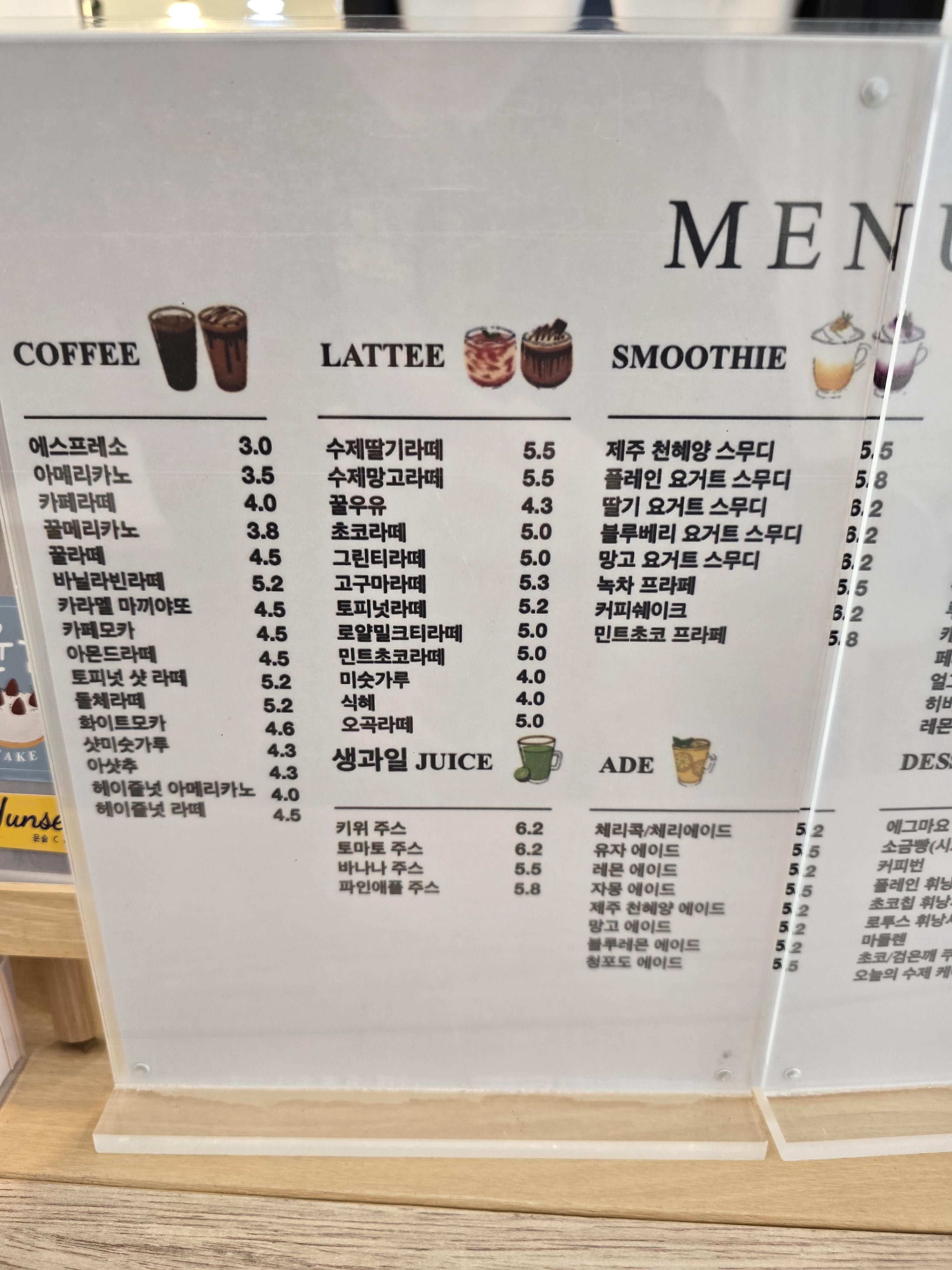 윤슬 카페의 메뉴판입니다