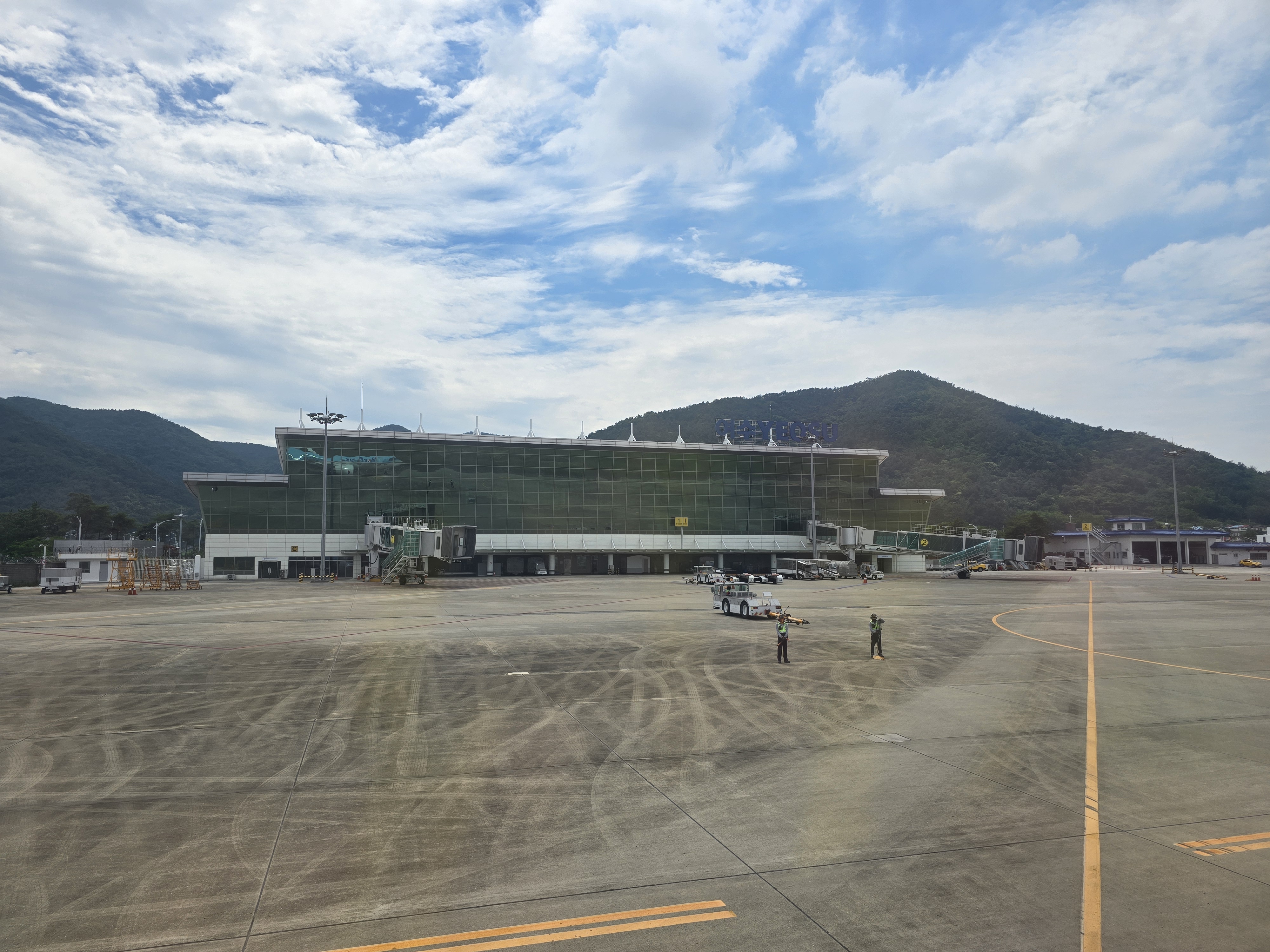 밖을 바라보니 여수공항에서 이륙을 준비 중입니다
