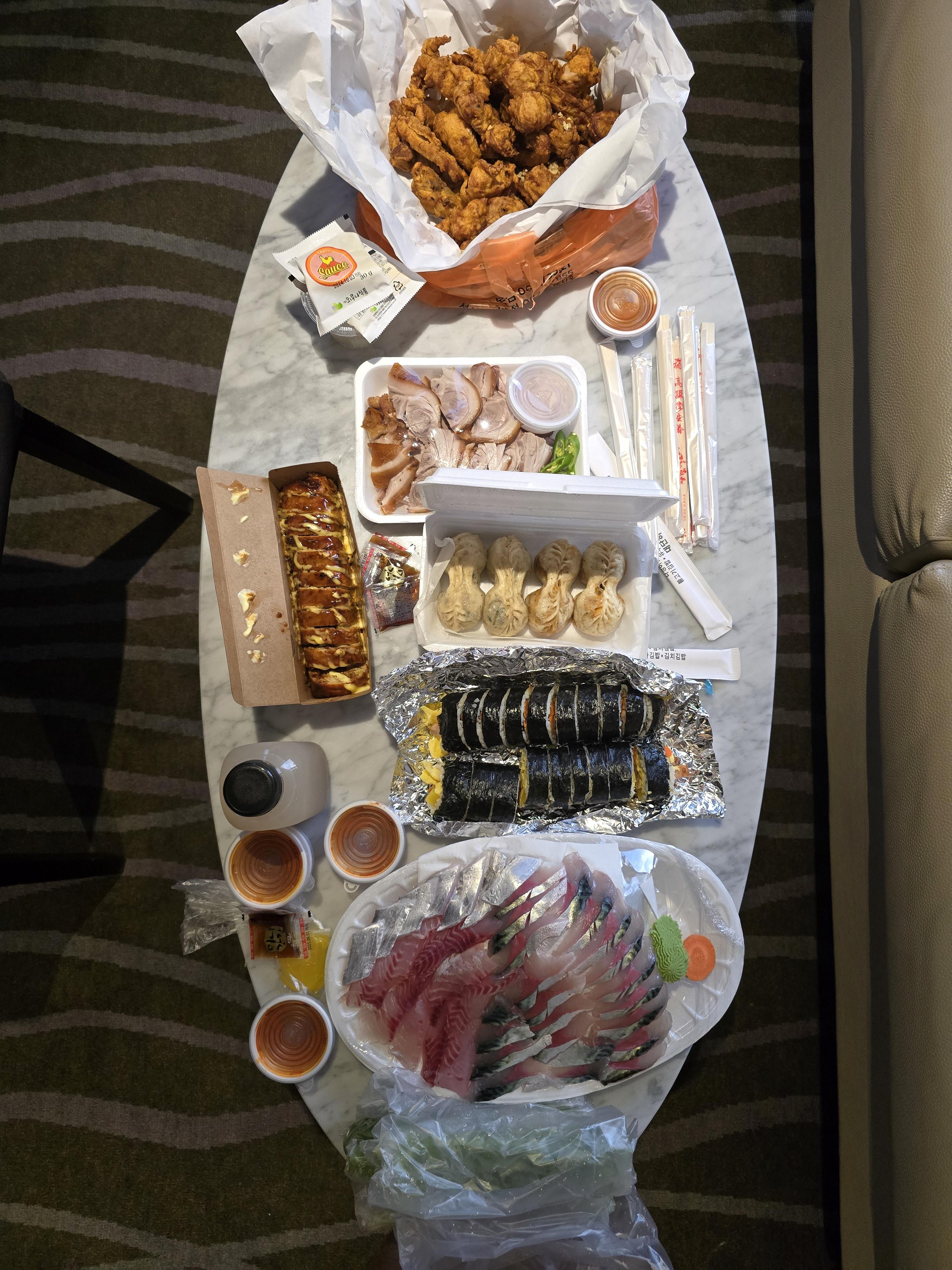 김밥과 회, 만두와 술을 구매했는데 혹시나 겹칠까 봐 두근두근